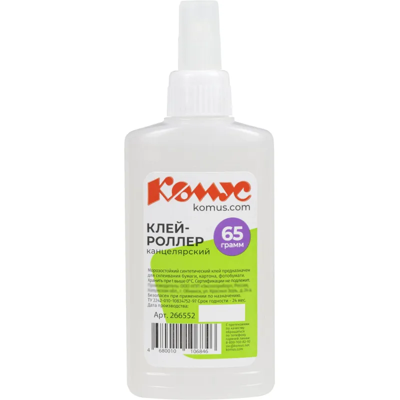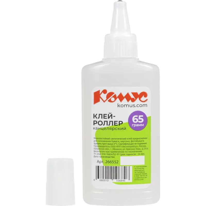 Канцелярский клей ’Комус’ с аппликатором-роллером (шарик из нержавеющей стали), который обеспечивает легкое и равномерное нанесение. Объем — 65 мл, бесцветный. Применяется для склеивания бумаги, картона, декоративных и поделочных работ. Съемный колпачок предохраняет клей от засыхания. Клей морозостойкий. Выдерживает 4 цикла заморозки/разморозки при температуре до −30 С (длительностью не более 15 суток). Клей имеет консистенцию — гель.