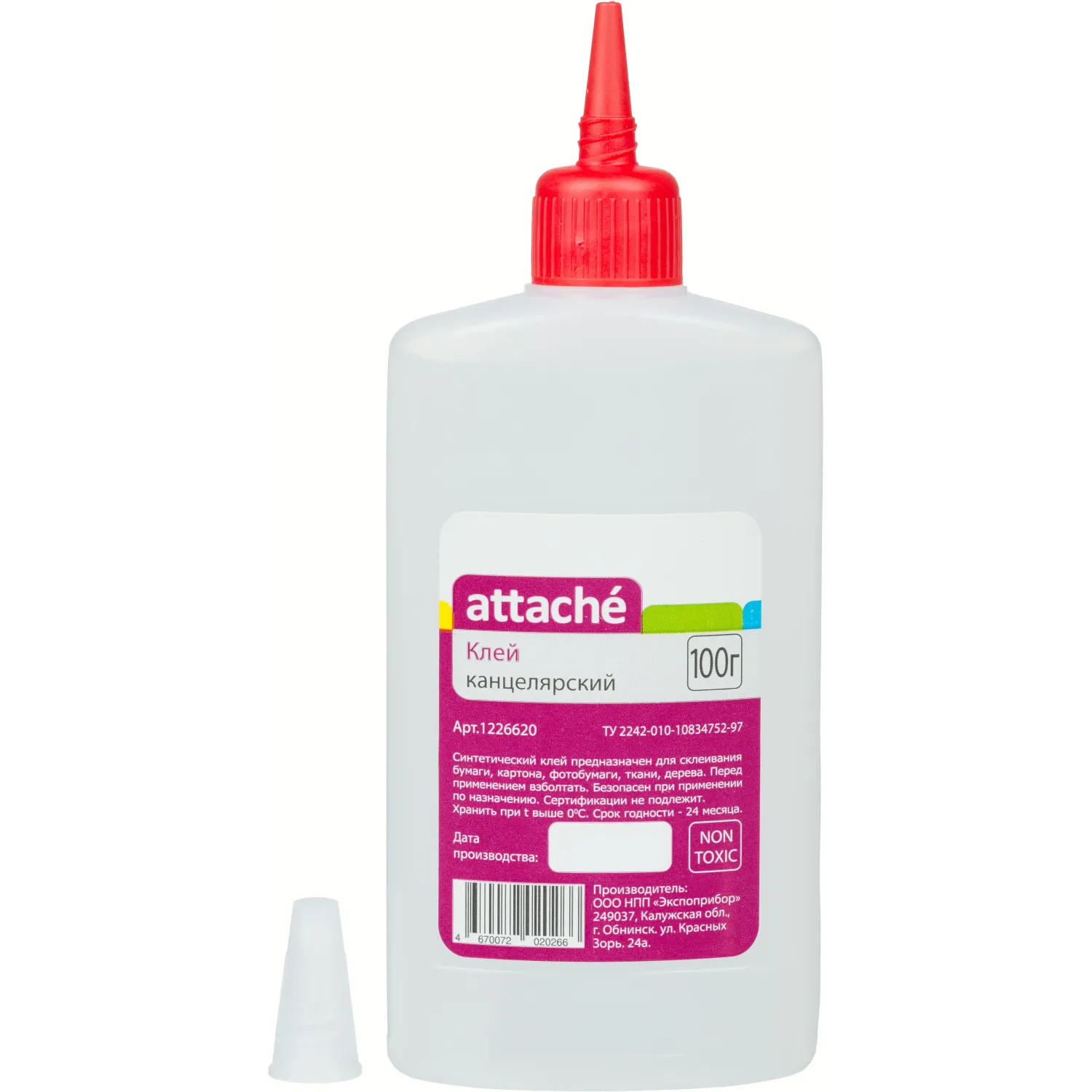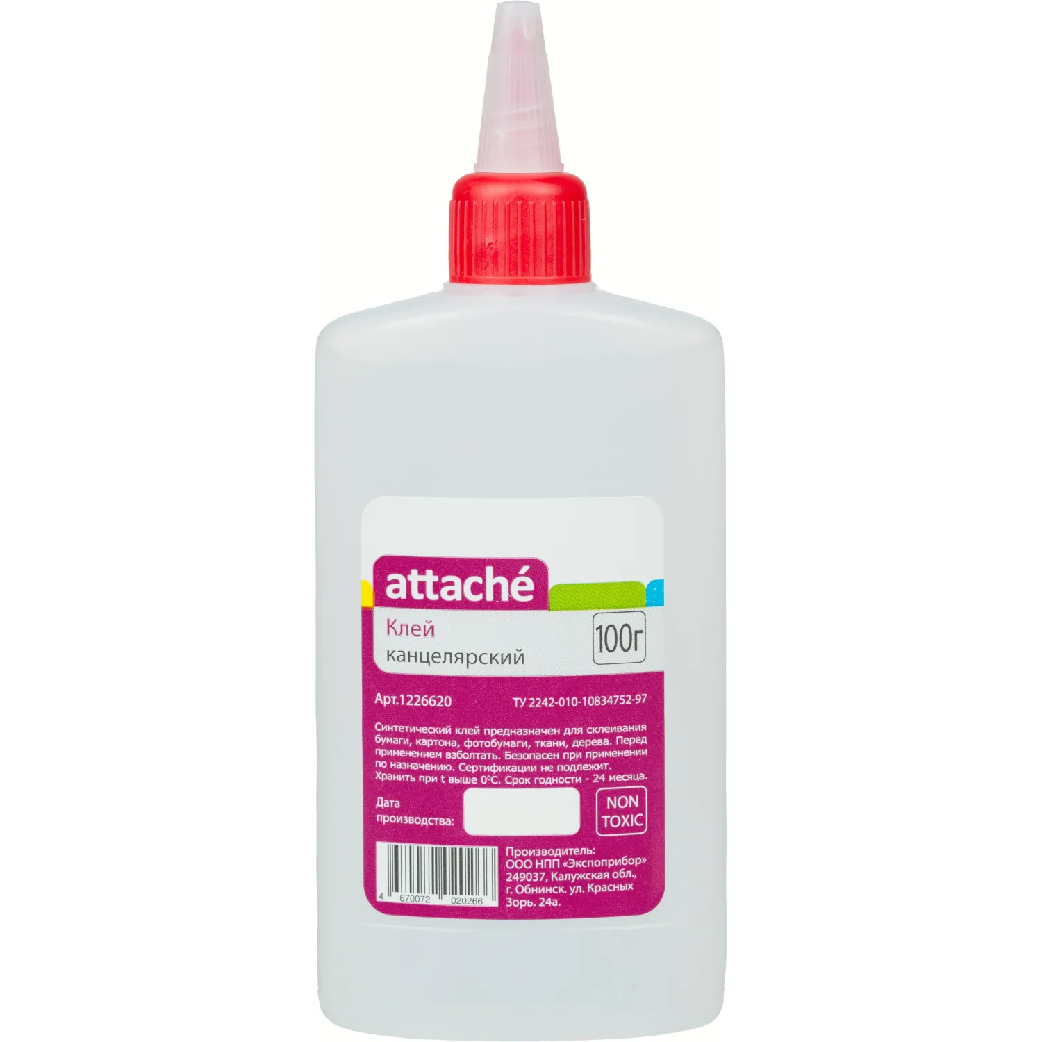 Синтетический канцелярский клей Attache 100 мл. Морозостойкий, прозрачный, высокого качества. Предназначен для офисных канцелярских работ по бумаге и картону, а также для приклеивания фотографий. Клей нетоксичен, не содержит растворителей. Удобный флакон оснащен крышкой-дозатором со съемным колпачком, защищающим от пересыхания при хранении.