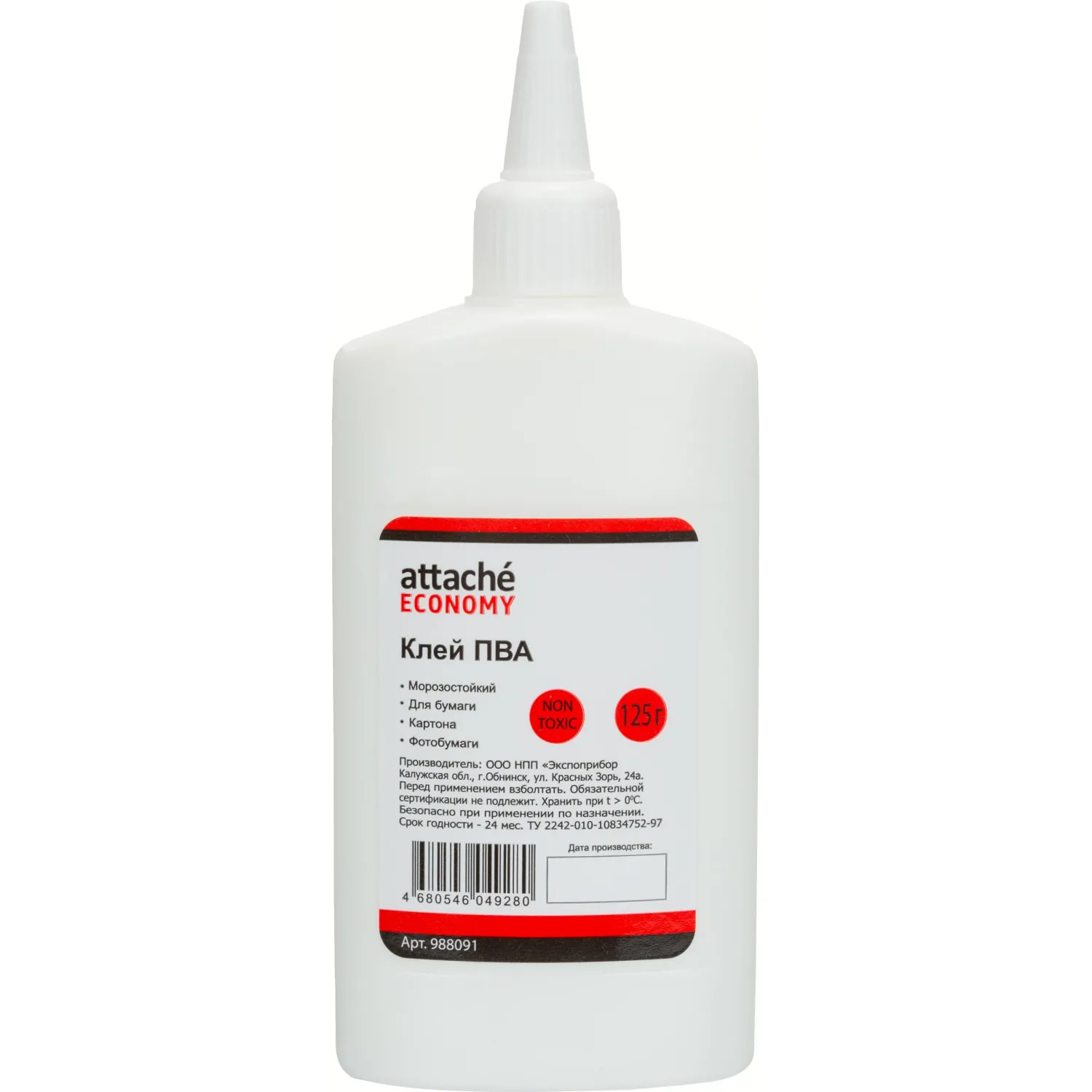 Клей ПВА Выбор есть (Attache Economy) предназначен для склеивания бумаги, картона, дерева, кожи, фотобумаги, текстиля. Отлично подходит для использования в канцелярских целях — незаменим в делопроизводстве. Пластиковый дозатор обеспечивает точное нанесение и экономный расход. Крышка-дозатор обеспечивает герметичности в закрытом состоянии и предохраняет клей от засыхания. Объем клея 125 г (125 мл). Клей ПВА при минусовых температурах замерзает, т. к. сделан на основе воды, но при оттаивании не теряет своих свойств. Его можно заморозить и размораживать 5 раз, и он не потеряет ни своих свойств, ни товарного вида. Температура воздуха при использовании не ниже 5. При длительном хранении допустимо выделение жидкой прозрачной фазы. Необходимо взболтать перед применением. Показатель прочности (клеящая способность): 0.36kH (1.15 Мпа).