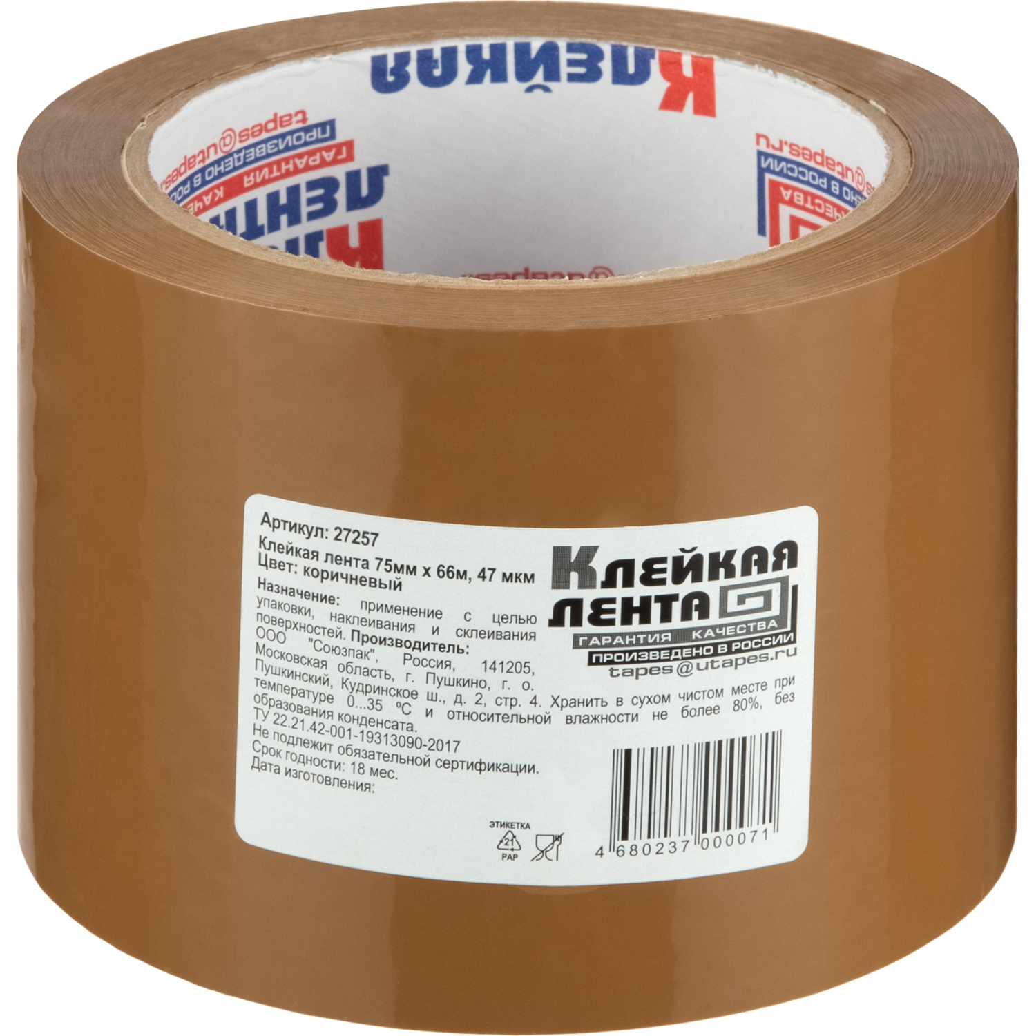 Упаковочная клейкая лента толщиной 47 мкм изготовлена на основе прозрачного полипропилена. Отличается высокой адгезией клея (слипанием с поверхностью), стойкостью к разрыву. Ширина ленты — 75 мм, длина рулона — 66 м. Широкая клейкая лента предназначена для упаковки объемных и тяжеловесных грузов, не теряет свойств на открытом воздухе при температуре от 10 до 30°C. Не хранить под прямыми солнечными лучами.