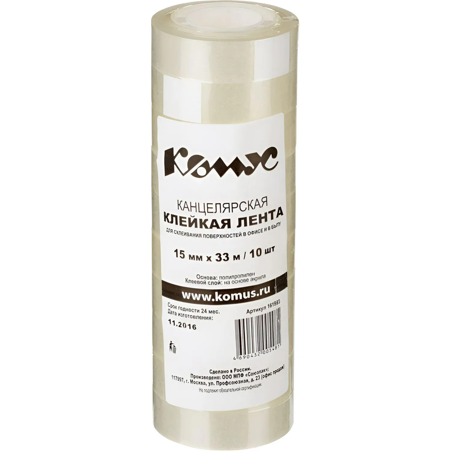 Клейкая лента канцелярская Комус прозрачная 15 мм x 33 м (10 штук в упаковке)