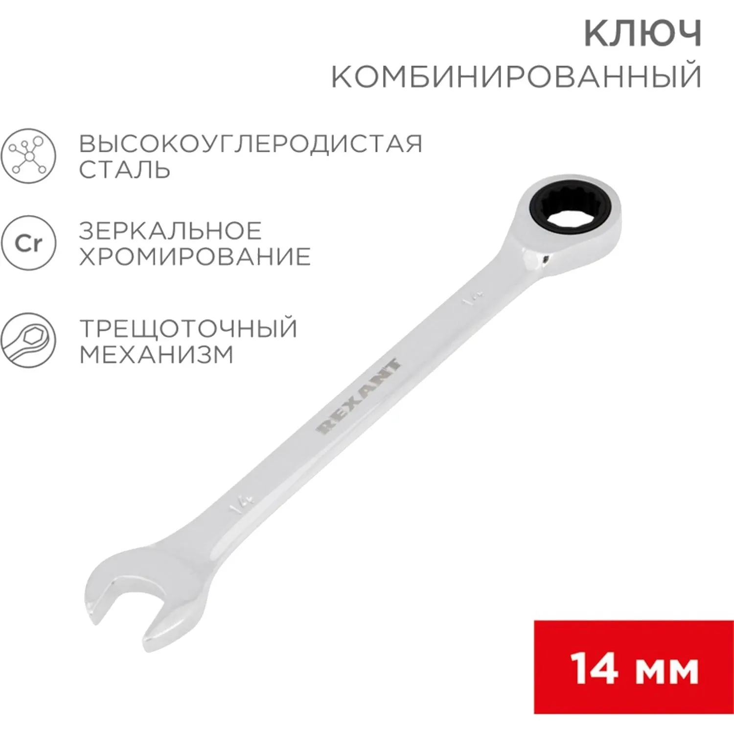 О товаре «Ключ комбинированный трещоточный 14мм, CrV, зеркальн. хром REXANT 12-5809-1»