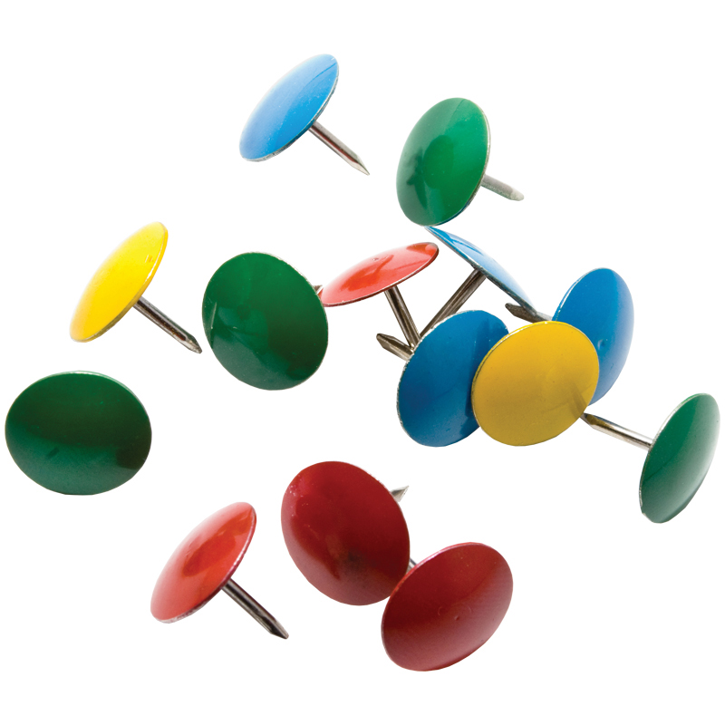 Кнопки-гвоздики никелированные с цветными головками для надежного крепления бумаги. Диаметр - 10 мм, длина острия - 7 мм. Упаковка в картонную коробочку - по 50 шт.