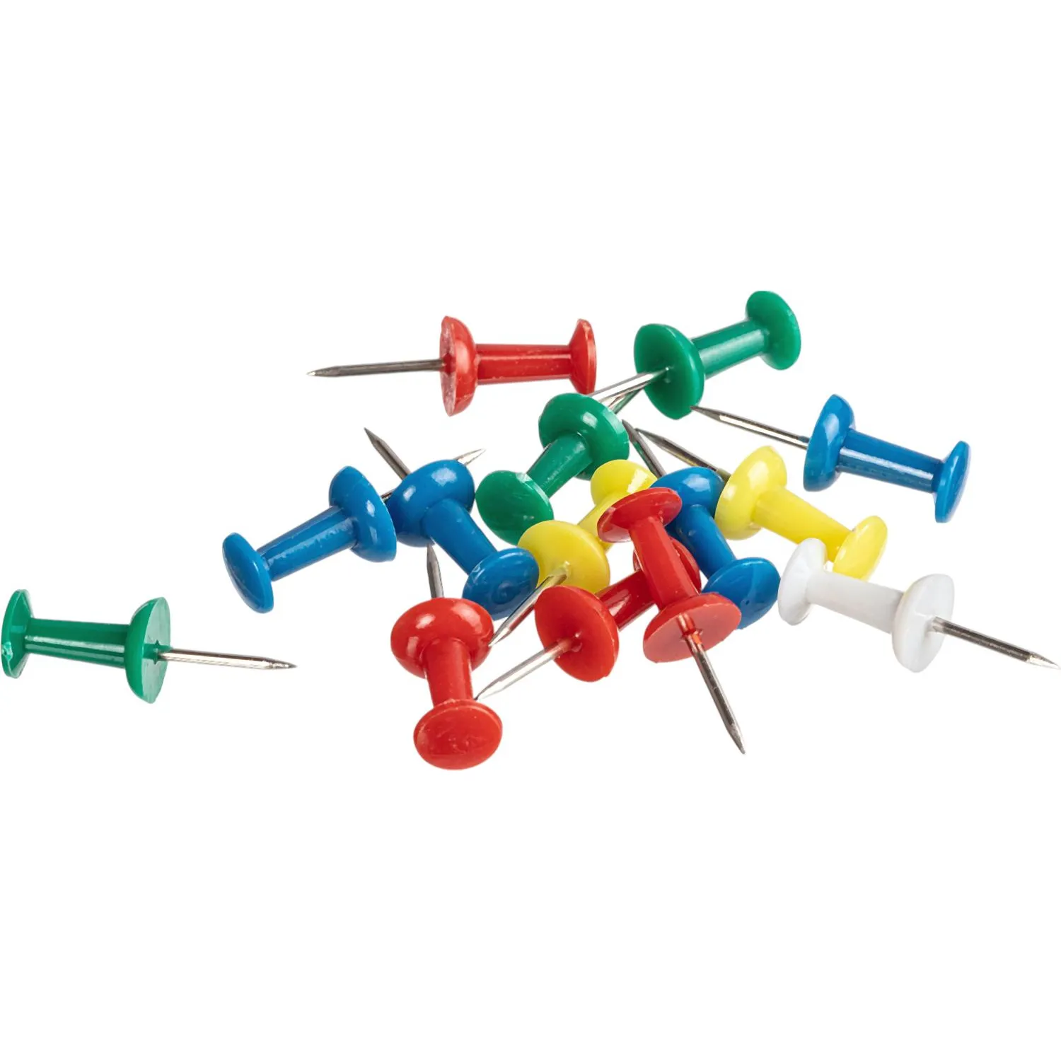 Кнопки силовые Выбор есть (Attache Economy) с пластиковым цветным держателем. Длина кнопки — 22 мм, длина иглы — 10 мм. Поставляются в картонной коробке по 50 штук. Используются для крепления информации к доскам пробкового типа, для планирования и отметок.