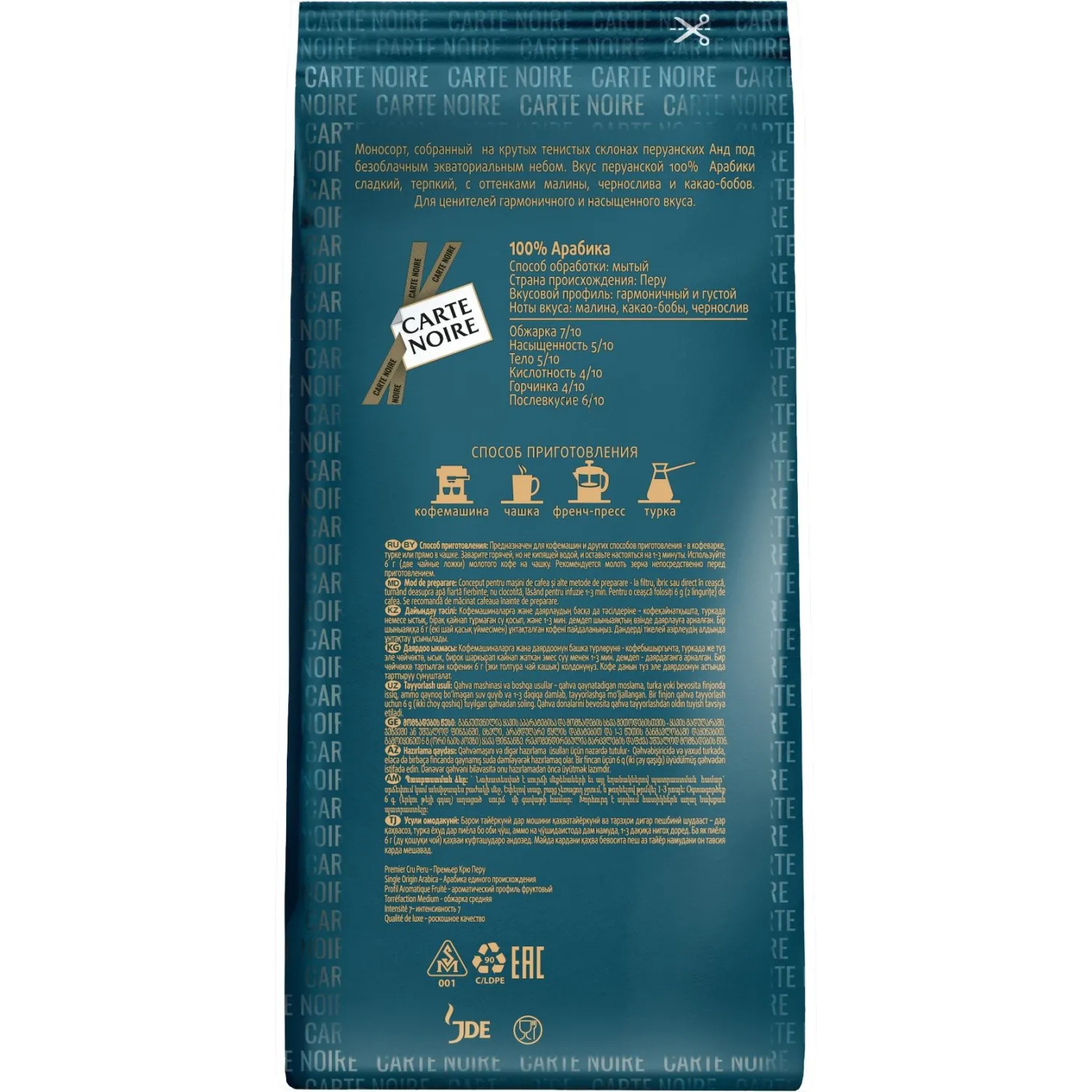 Кофе натуральный жареный в зёрнах Carte Noire Premier Cru Peru 800 г — моносорт, собранный на крутых тенистых склонах перуанских Анд под безоблачным экваториальным небом. Вкус сладкий, терпкий, с оттенками малины, чернослива и какао-бобов. Для ценителей гармоничного и насыщенного вкуса. Подходит для приготовления в автоматических кофемашинах. Производится в России и упакован в вакуумный пакет с клапаном дегазации, который позволяет выходить углекислому газу, сохраняя свежесть продукта и предотвращая повреждение упаковки.