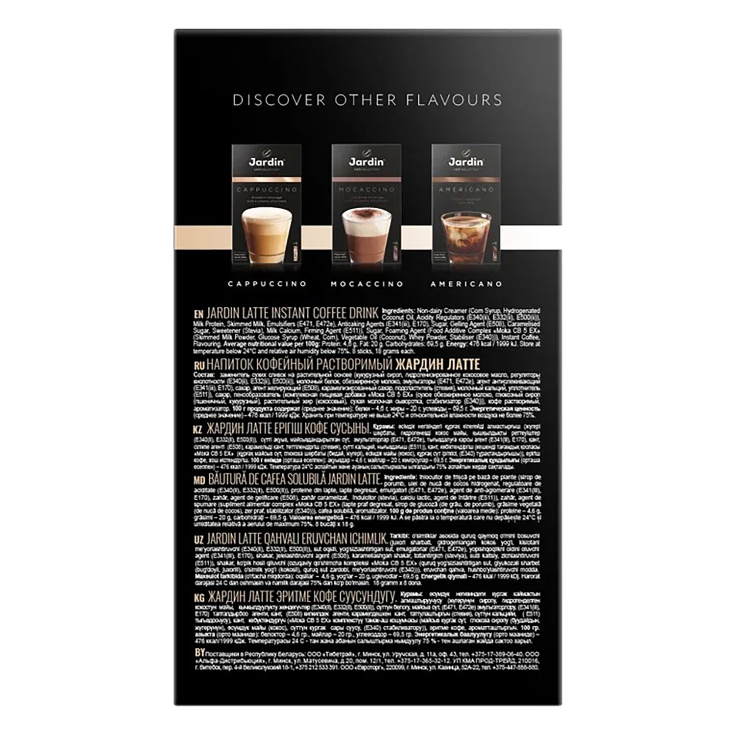 Состав: заменитель сухих сливок на растительной основе, молочный белок, обезжиренное молоко, эмульгаторы, агент антислеживающий, сахар, агент желирующий, карамелизированный сахар, подсластитель, молочный кальций, уплотнитель, сахар, кофе растворимый, пенообразователь, растительный жир, сухая молочная сыворотка, стабилизатор, ароматизатор.