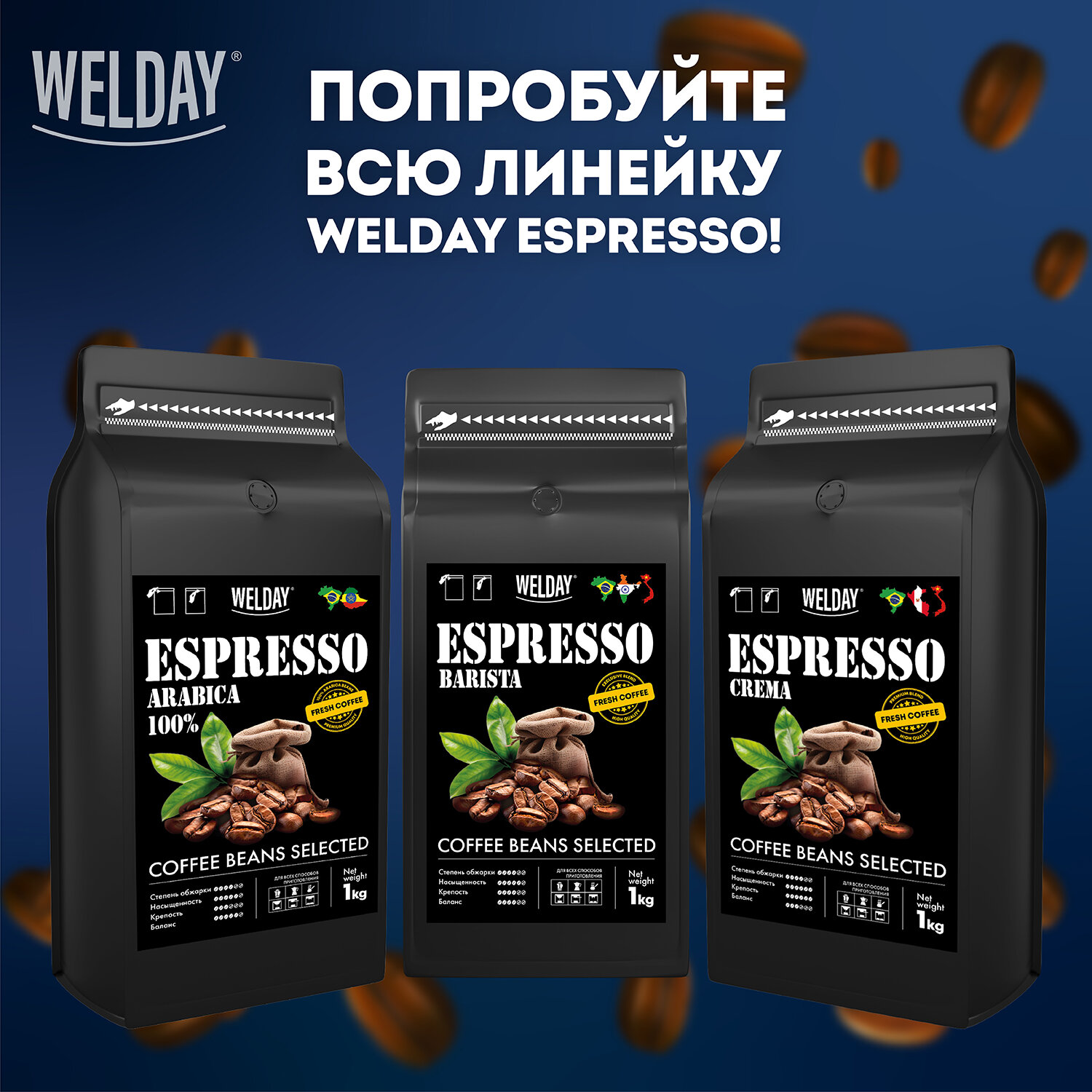 Вкуснейший кофе в зернах 1кг WELDAY отлично подойдет ценителям брендов Movenpick, Lavazza, Dallmayr, Paulig, Egoiste, Bushido, Illy, Starbucks, HAUSBRANDT, LOFBERGS, а также подойдет для замены кофе 3 в 1.