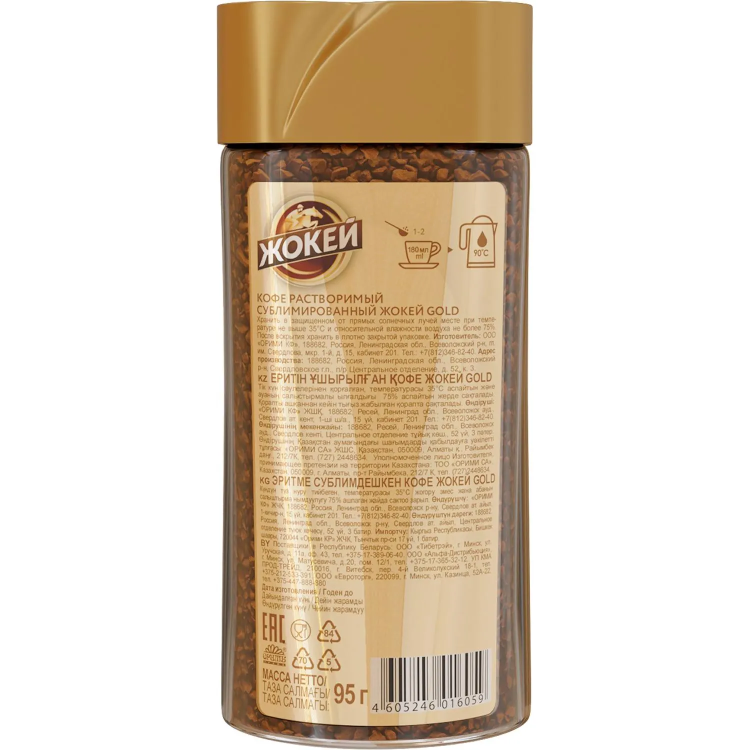 Кофе растворимый Жокей Gold 95 г (стеклянная банка). Кофе растворимый сублимированный Жокей Gold: интенсивный вкус и благородный аромат свежезаваренного кофе наполняют энергией, силой и уверенностью изо дня в день. Жокей Gold — верный способ побороть собственную лень и перестать откладывать дела на потом, наслаждаясь результатом и любимым напитком. Ароматный сублимированный кофе с интенсивным вкусом. Жокей Голд создан из отборных сортов арабики, собранной на высокогорных плантациях Южной Америки. Уникальные природные условия, вулканические почвы и проверенные традиции обработки кофейных зерен создают яркий, насыщенный вкус, в котором хорошо различимы сложные оттенки. Новый продукт отличает миндально-коньячный сбалансированный профиль с легкой горчинкой и кислинкой.