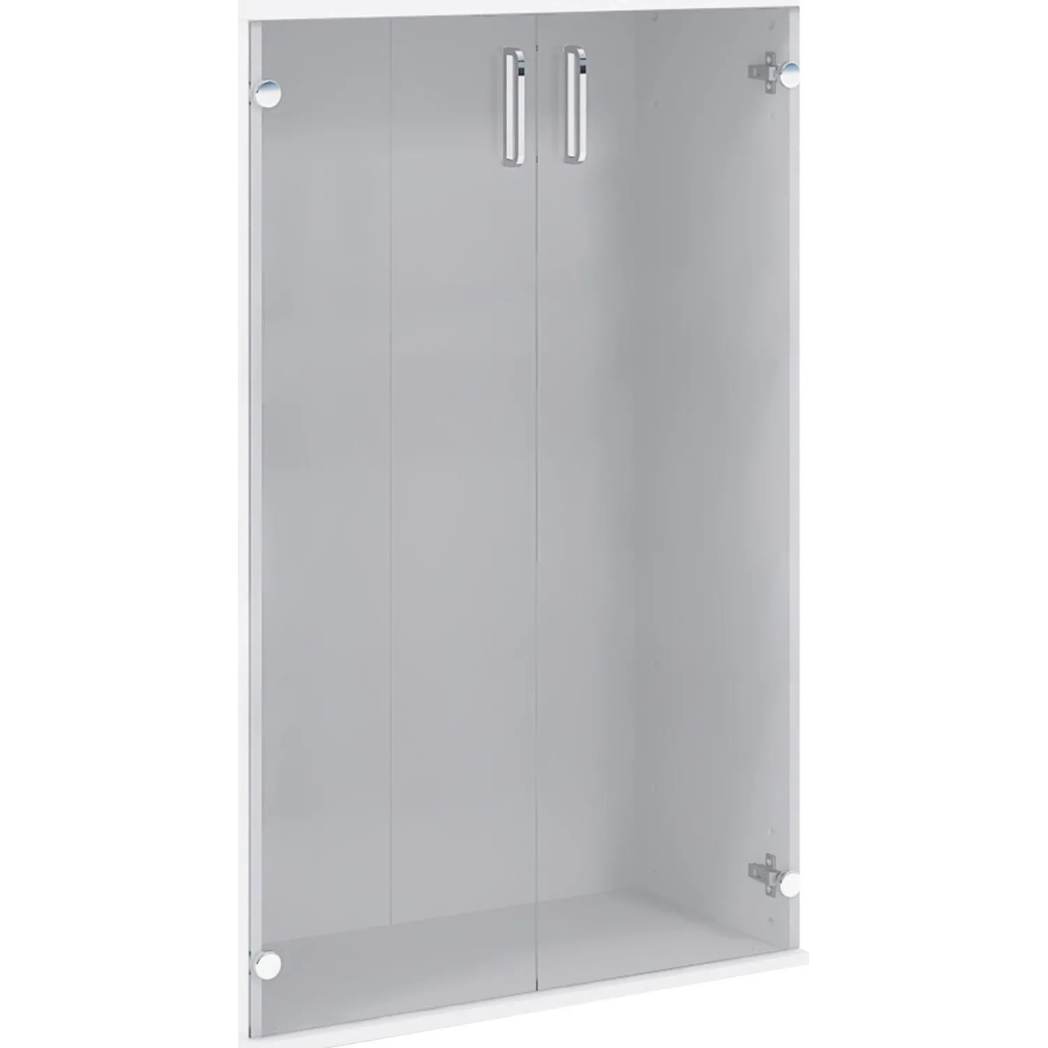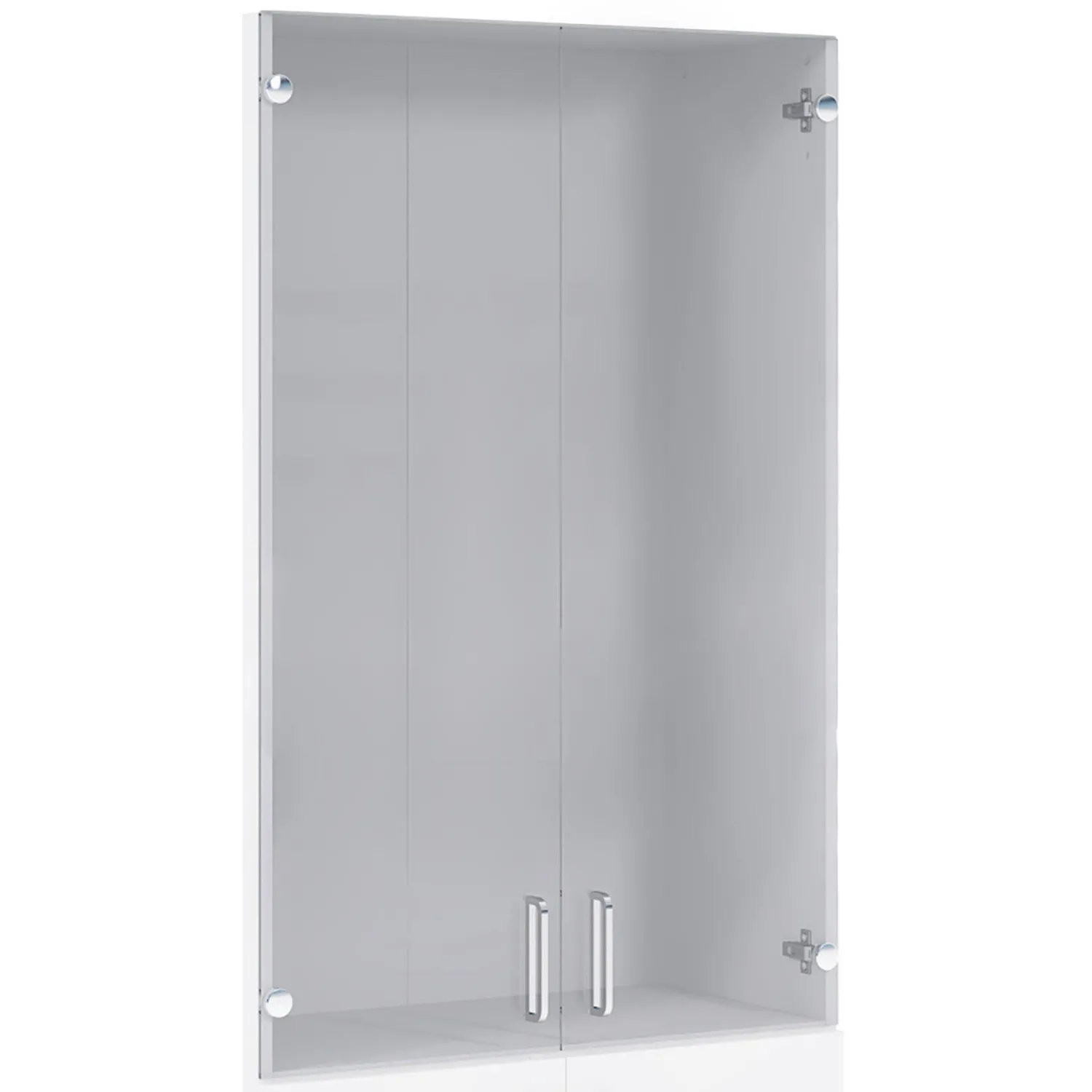 Стеклянные фасады. Стекло прозрачное закалённое толщиной 5 мм — крепятся к каркасу шкафа на стекольных петлях с декоративными колпачками в комплекте.