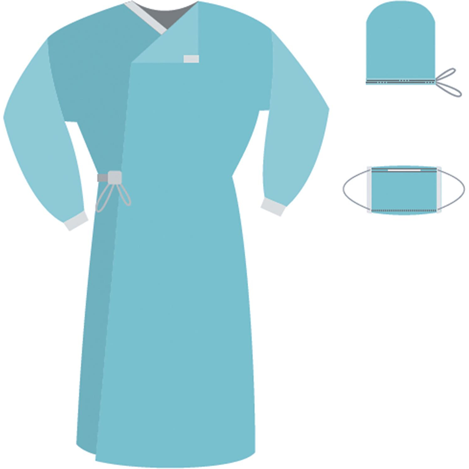 Халат хирургический, размер 52-54, длина 140 см. На спине — глубокий запах (стерильная спина), четыре завязки на поясе, рукав на трикотажном манжете, окантованный ворот на регулируемой застежке типа Велькро, наружный сварной (безниточный) шов. Изготовлен из гипоаллергенного, безворсового, воздухопроницаемого, водоотталкивающего полипропиленового нетканого материала плотностью 42 г/м. кв. Халат сложен специальным образом, обеспечивающим стерильность изделия при надевании.
