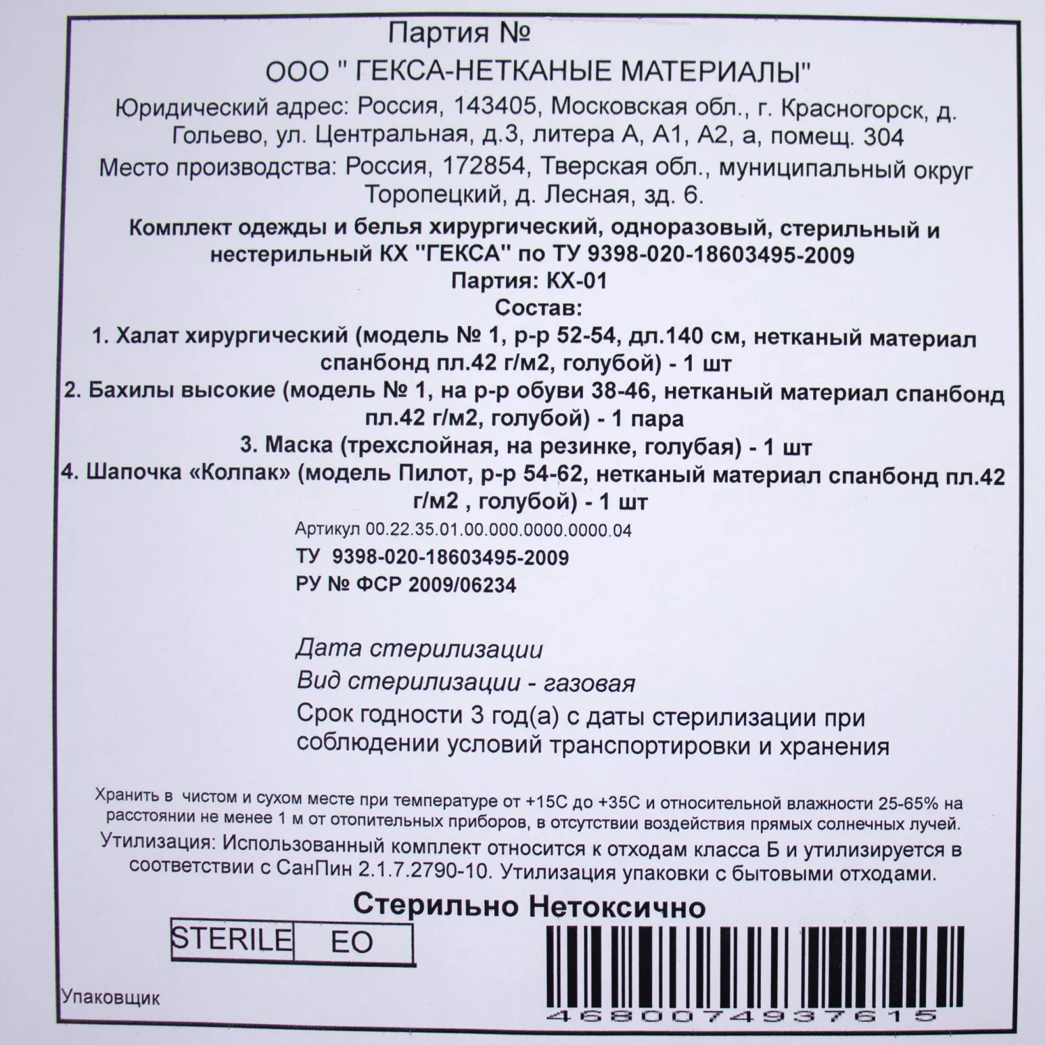 О товаре «Комплект одноразового белья Гекса КХ-01 хирургический стерильный (4 предмета)»