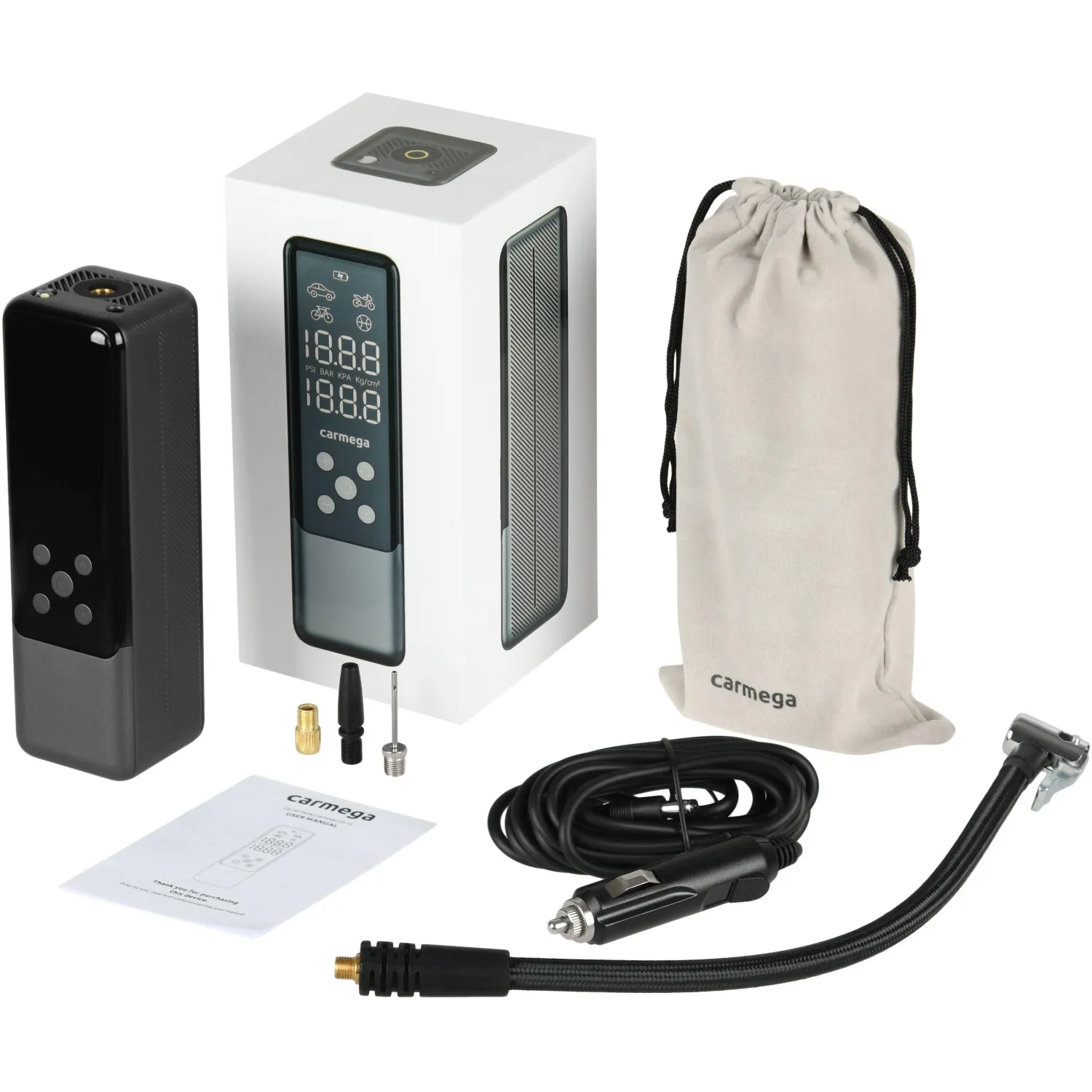 Комплектация: воздушный компрессор, набор переходников 3 шт., кабель DC 12 В, чехол для хранения, руководство по эксплуатации.