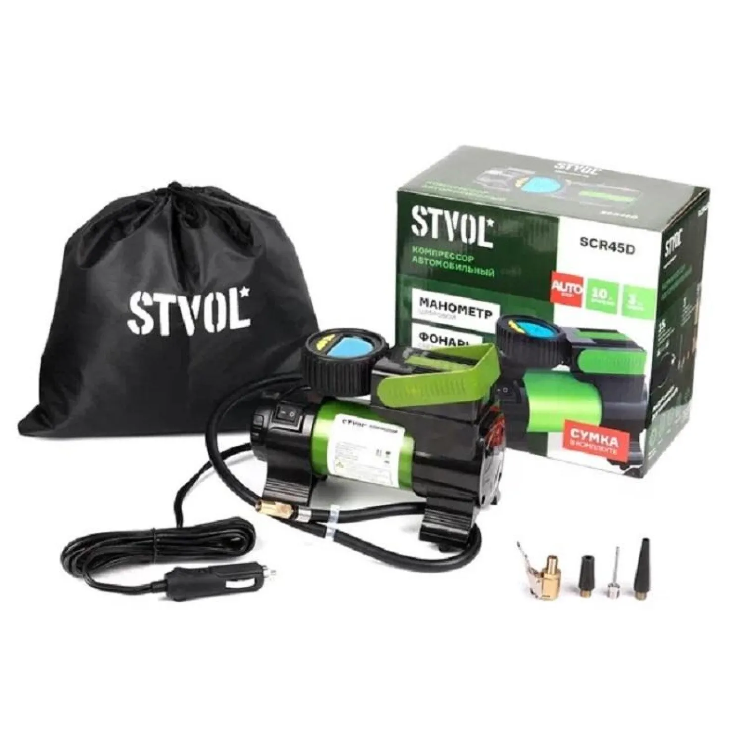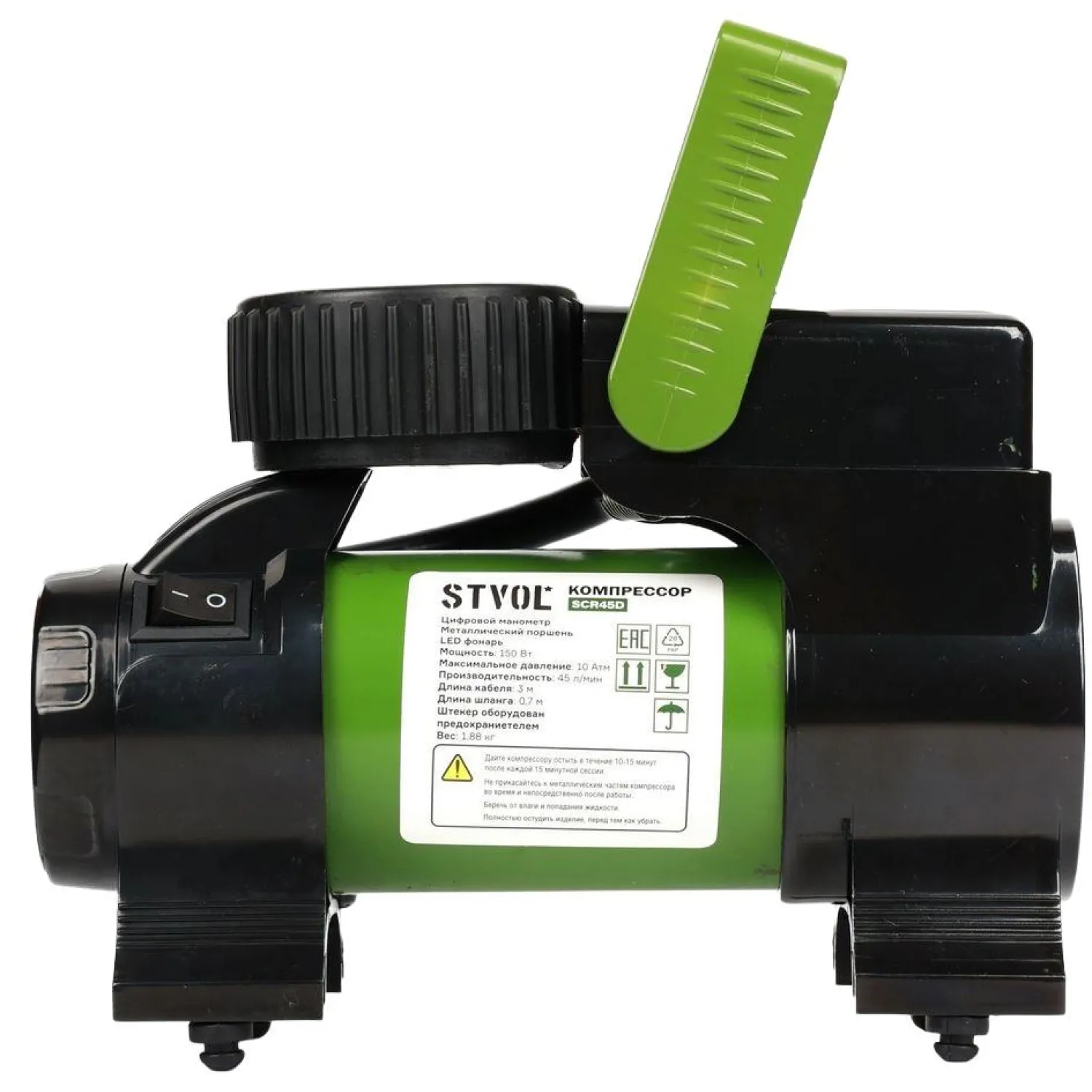 О товаре «Компрессор автомобильный STVOL SCR45D, манометр, фонарь 45 л/мин, 14А»