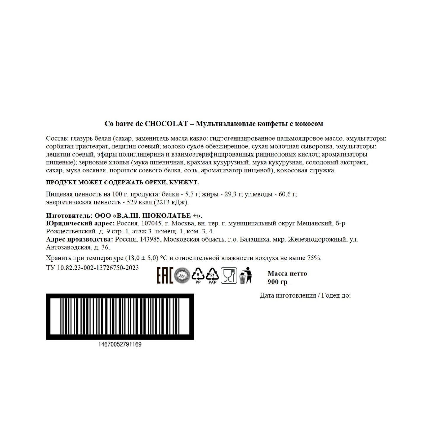 О товаре «Конфеты Co barre de Chocolat мультизлаковые с кокосом 900 г»