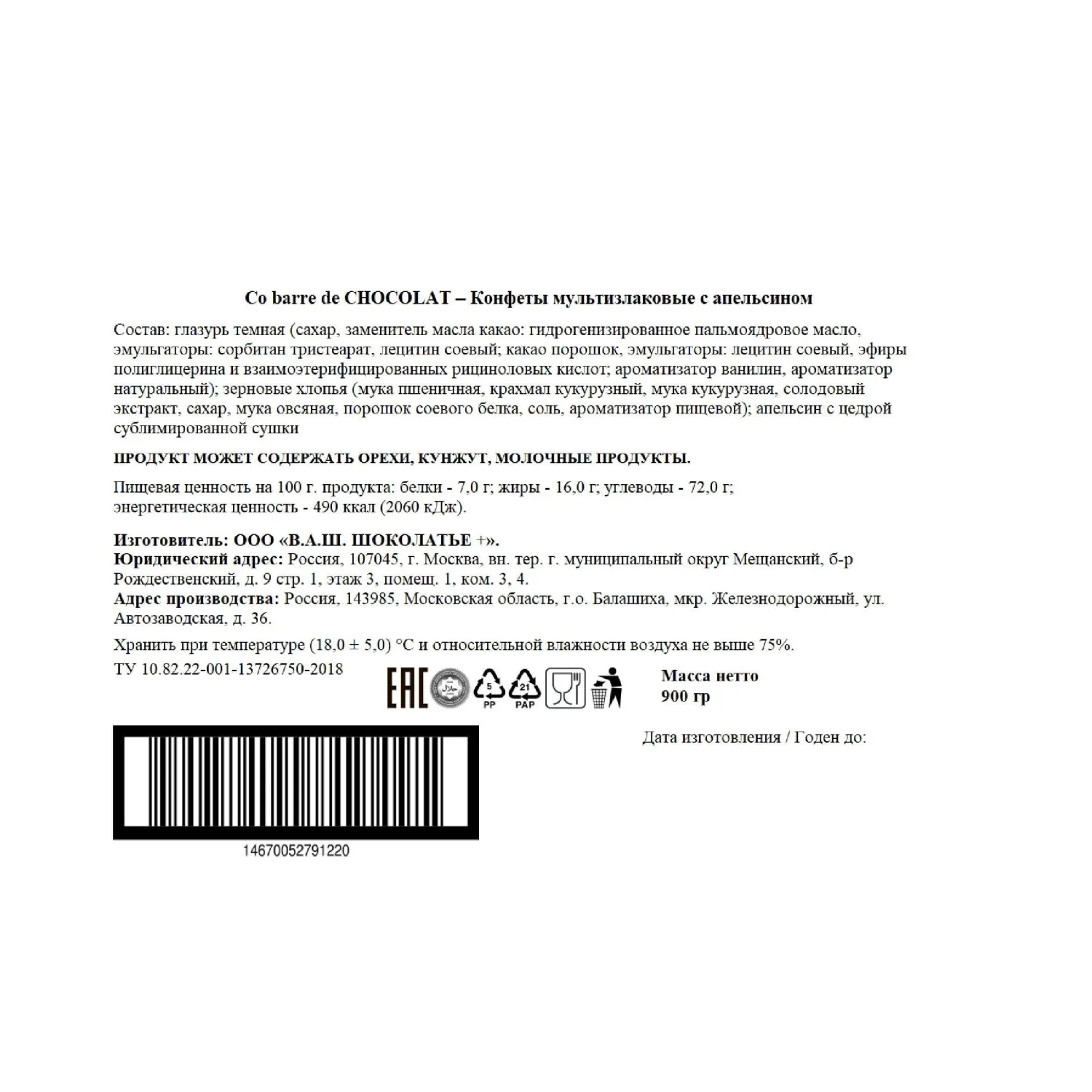 Состав: глазурь тёмная (сахар, заменитель масла какао: гидрогенизированное пальмоядровое масло, эмульгаторы: сорбитан тристеарат, лецитин соевый; какао порошок, эмульгаторы: лецитин соевый, эфиры полиглицерина и взаимоэтерифицированных рициноловых кислот; ароматизатор ванилин, ароматизатор натуральный); зерновые хлопья (мука пшеничная, крахмал кукурузный, мука кукурузная, солодовый экстракт, сахар, мука овсяная, порошок соевого белка, соль, ароматизатор пищевой); апельсин с цедрой сублимированной сушки.