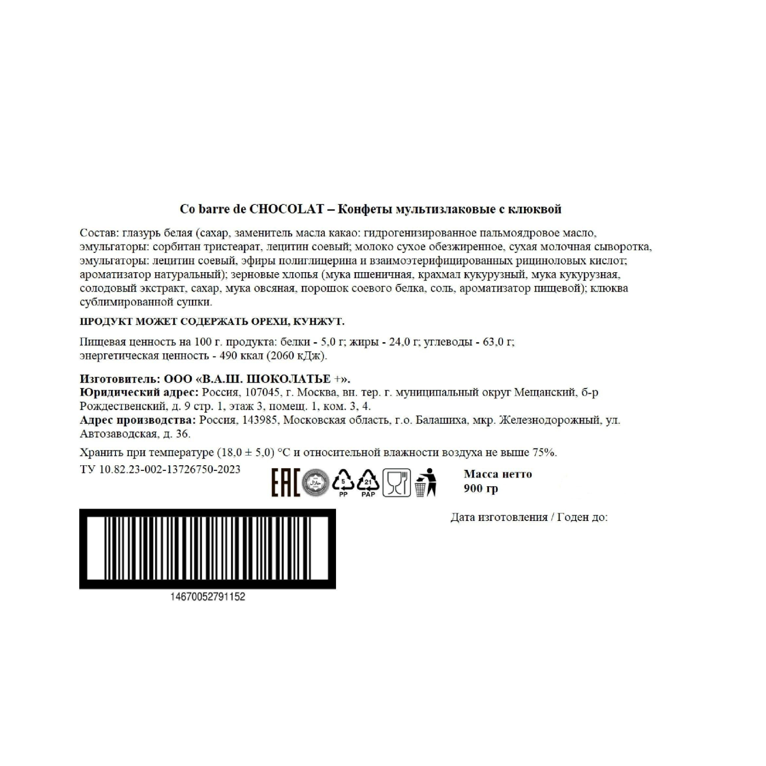 Состав: глазурь белая (сахар, заменитель масла какао: гидрогенизированное пальмоядровое масло, эмульгаторы: сорбитан тристеарат, лецитин соевый; молоко сухое обезжиренное, сухая молочная сыворотка, эмульгаторы: лецитин соевый, эфиры полиглицерина и взаимоэтерифицированных рициноловых кислот; ароматизаторы пищевые); зерновые хлопья (мука пшеничная, крахмал кукурузный, мука кукурузная, солодовый экстракт, сахар, мука овсяная, порошок соевого белка, соль, ароматизатор пищевой); клюква сублимированной сушки, ароматизатор натуральный.