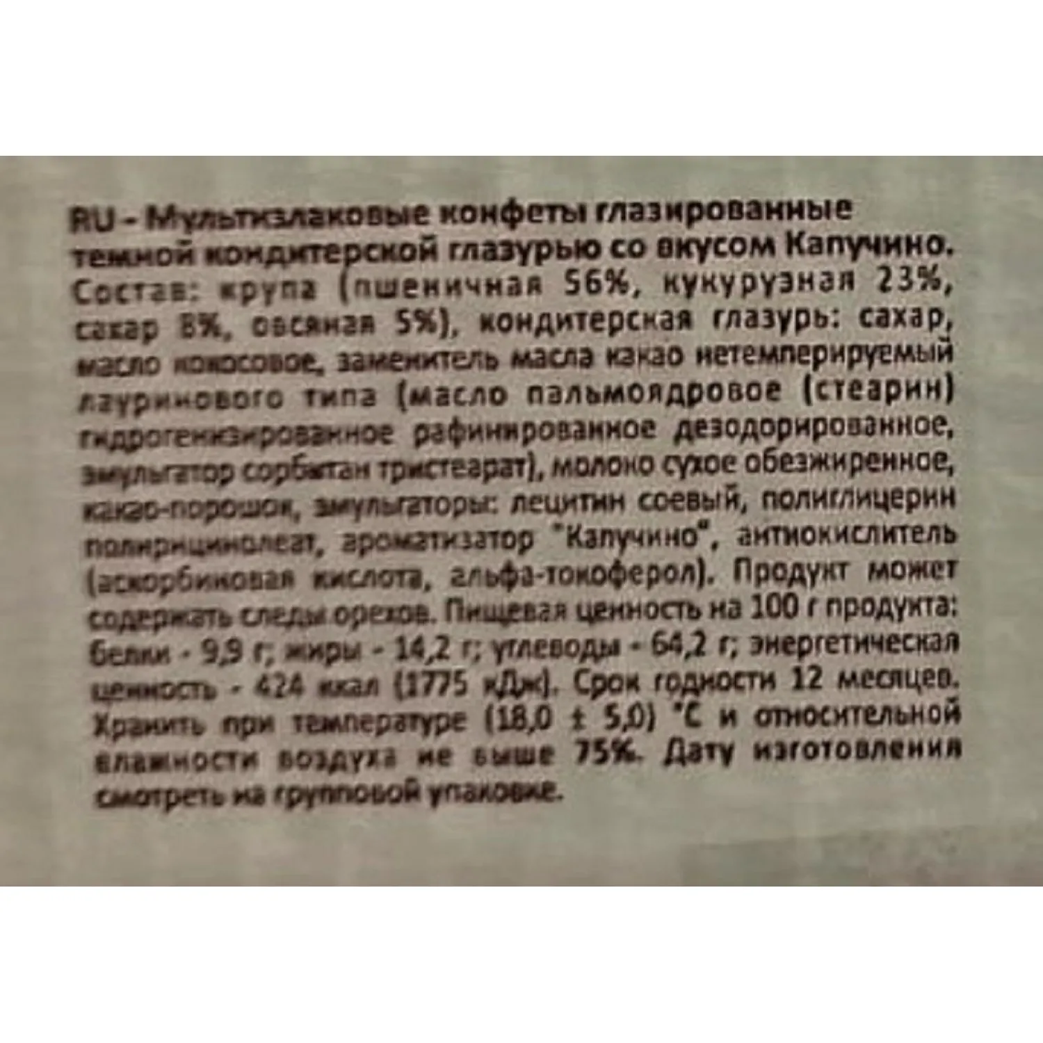 Состав: крупа (пшеничная 56%, кукурузная 23%, сахар 8%, овсяная 5%), кондитерская глазурь: сахар, масло кокосовое, заменитель масла какао нетемперируемый лауринового типа (масло пальмоядровое (стеарин) гидрогенизированное рафинированное дезодорированное, эмульгатор сорбитан тристеарат), молоко сухое обезжиренное, какао-порошок, эмульгаторы: лецитин соевый, полиглицерин полирицинолеат, ароматизатор «Капучино», антиокислитель (аскорбиновая кислота, альфа-токоферол). Продукт может содержать следы орехов.