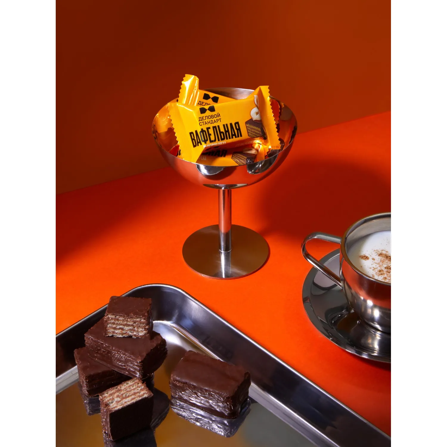 Хрустящая вафельная конфета Деловой Стандарт с прослойкой из крема со вкусом ореха станет вашим любимым дополнением к чаю и кофе.