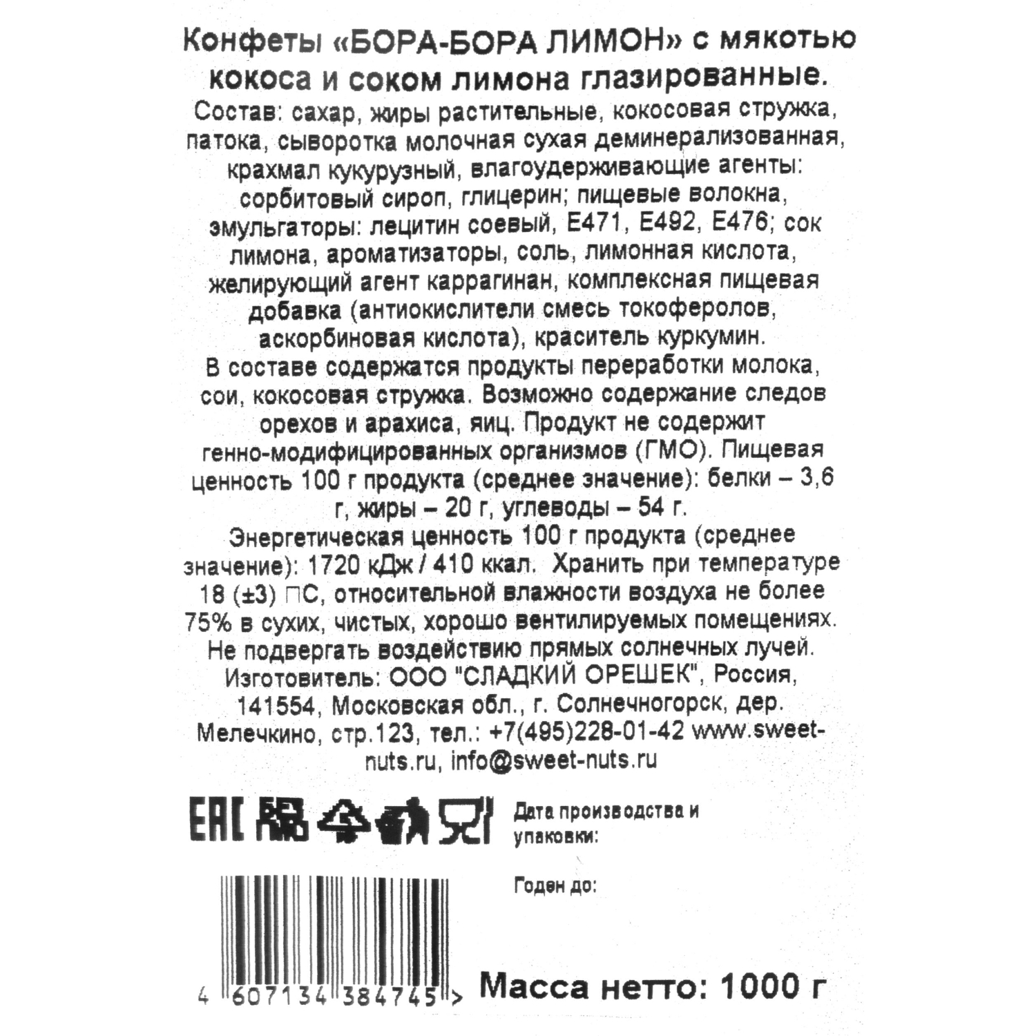Состав: сахар, жиры растительные, кокосовая стружка, патока, сыворотка молочная сухая деминерализованная, крахмал кукурузный, влагоудерживающие агенты: сорбитовый сироп, глицерин; пищевые волокна, эмульгаторы: лецитин соевый, E471, Е492, E476; сок лимона, ароматизаторы, соль, лимонная кислота, желирующий агент каррагинан, комплексная пищевая добавка (антиокислители смесь токоферолов, аскорбиновая кислота), краситель куркумин.