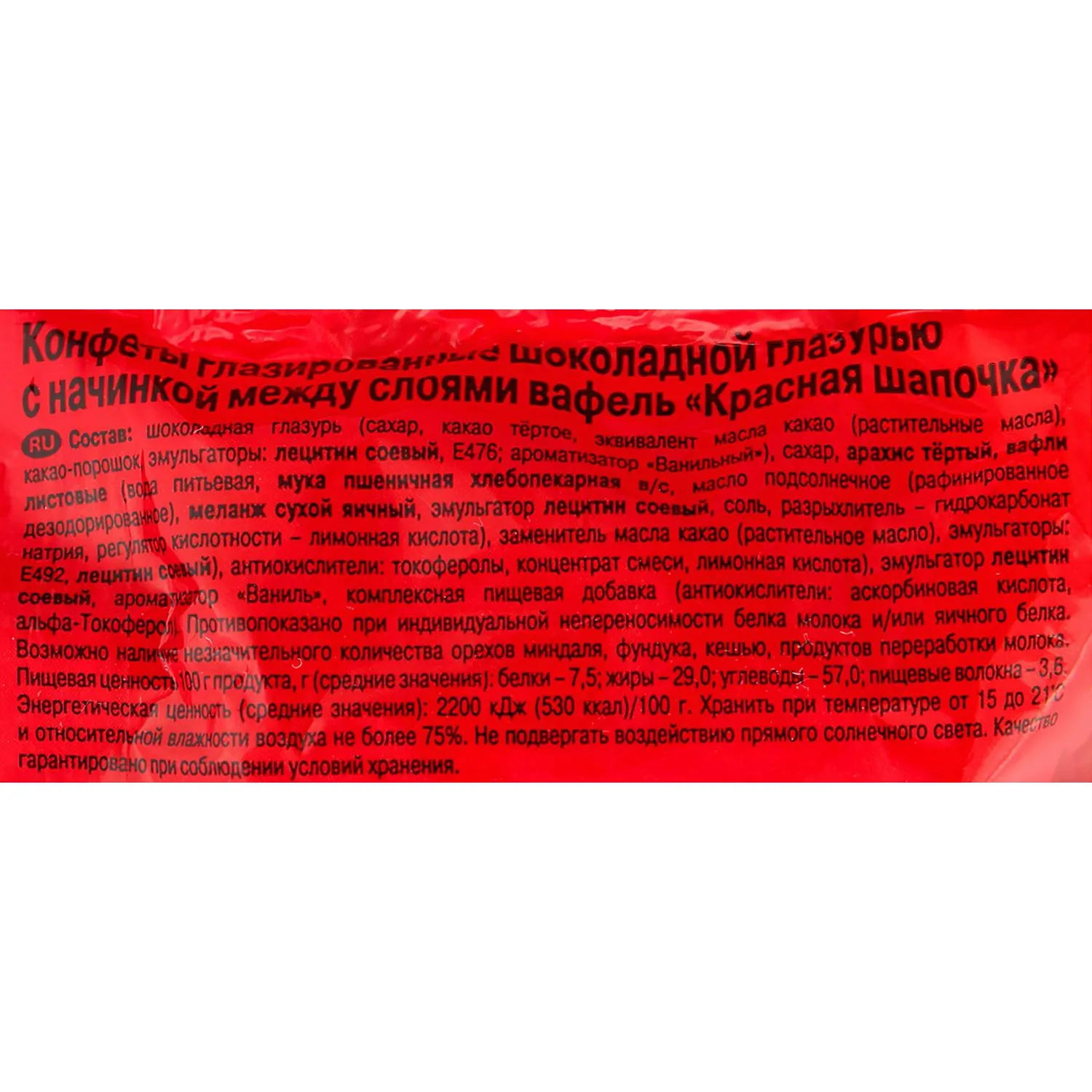 Состав: шоколадная глазурь (сахар, какао тертое, эквивалент масла какао (рафинированные, дезодорированные, фракционированные, негидрогенизированные растительные масла (пальмовое, ши)), какао порошок, эмульгаторы: лецитин соевый, Е476, ароматизатор «Ванильный»), сахар, арахис тертый, вафли листовые (вода питьевая, мука пшеничная хлебопекарная в/с, масло подсолнечное (рафинированное, дезодорированное), меланж сухой яичный, эмульгатор лецитин соевый, соль, разрыхлитель — гидрокарбонат натрия, регулятор кислотности — лимонная кислота), заменитель масла какао (частично гидрогенизированная фракция пальмового масла, эмульгаторы Е492, лецитин соевый, антиокислители токоферолы, концентрат смеси, лимонная кислота), эмульгатор лецитин соевый), ароматизатор «Ваниль», антиокисли##ель — аскорбиновая кислота.
