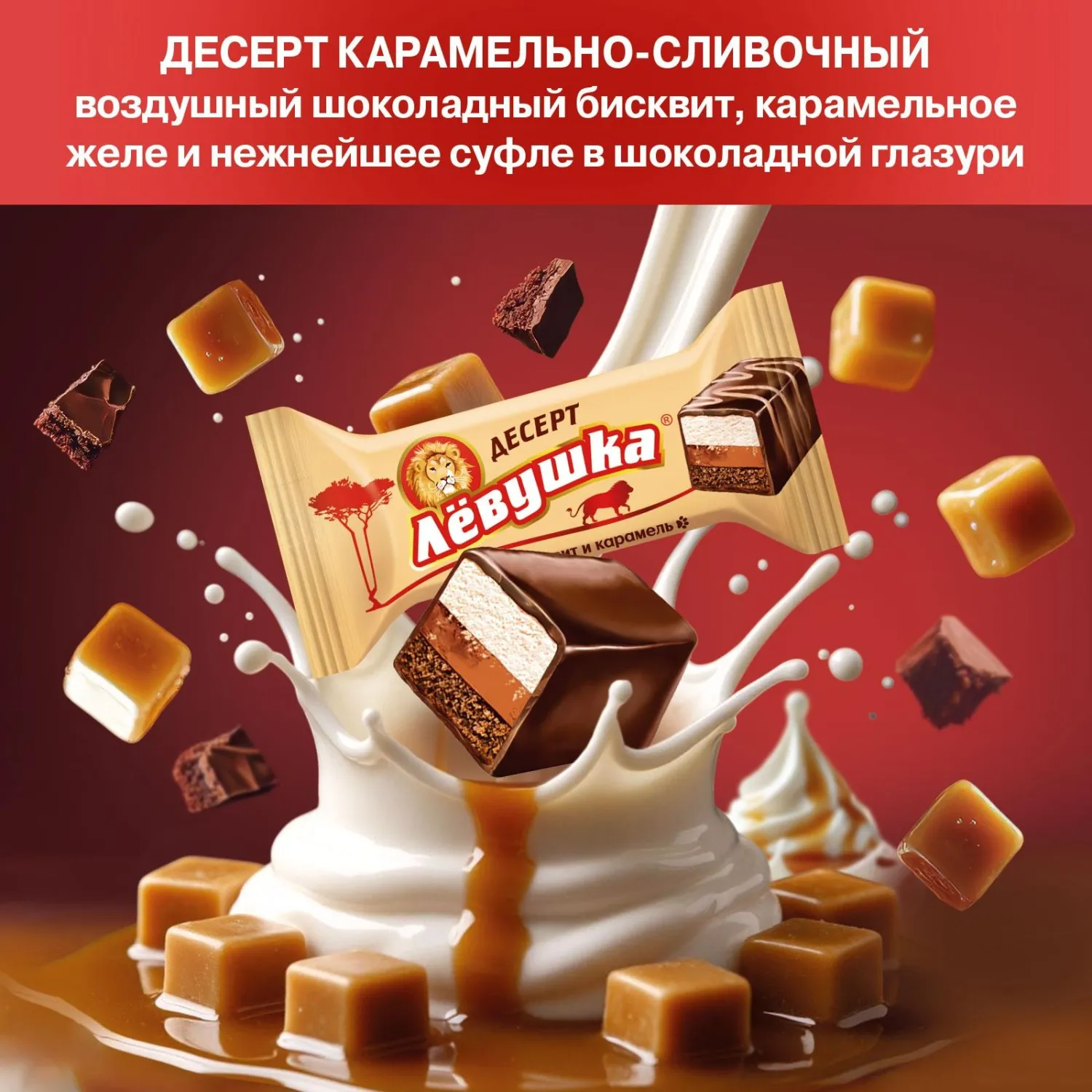 Восхитительный трехслойный десерт — нежный шоколадный бисквит, карамельное желе и сливочное суфле в великолепной глазури.