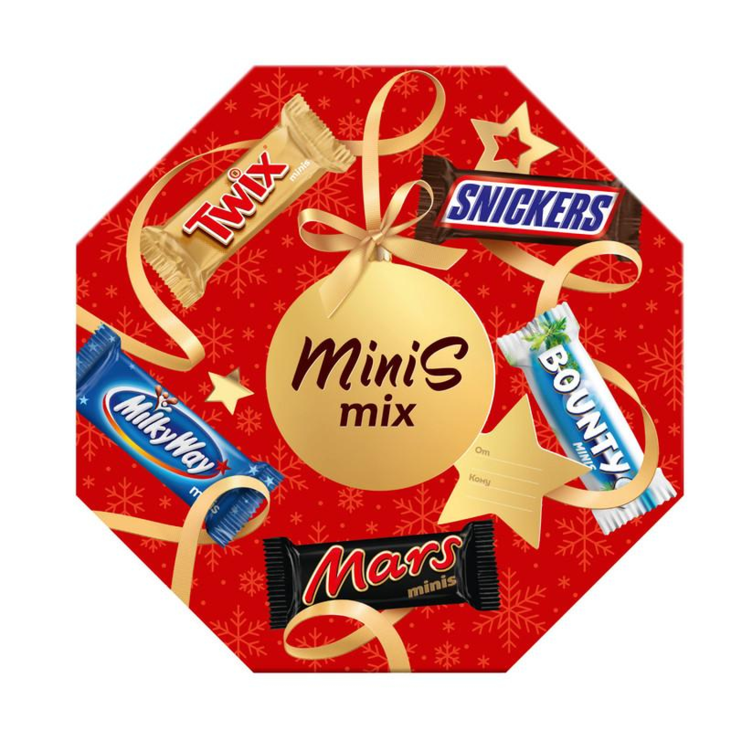 Состав: Набор подарочный кондитерских изделий: шоколадные батончики SNICKERS MINIS, MILKY WAY minis, MARS minis; конфеты BOUNTY; печенье TWIX minis. Шоколадный батончик SNICKERS MINIS с жареным арахисом, карамелью и нугой, покрытый молочным шоколадом. Количество — 6 штук.