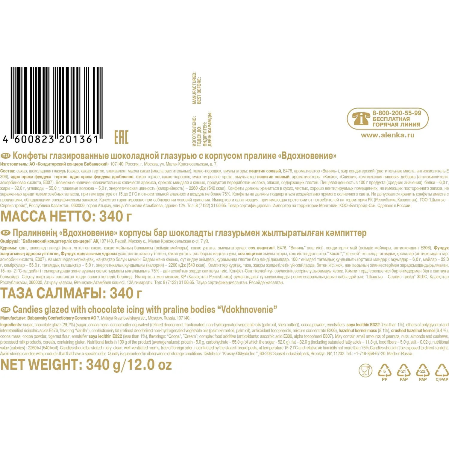Конфеты упакованы в картонную коробку весом 340 г. Размер упаковки — 355×175×27 мм. Срок хранения составляет 9 месяцев с даты производства