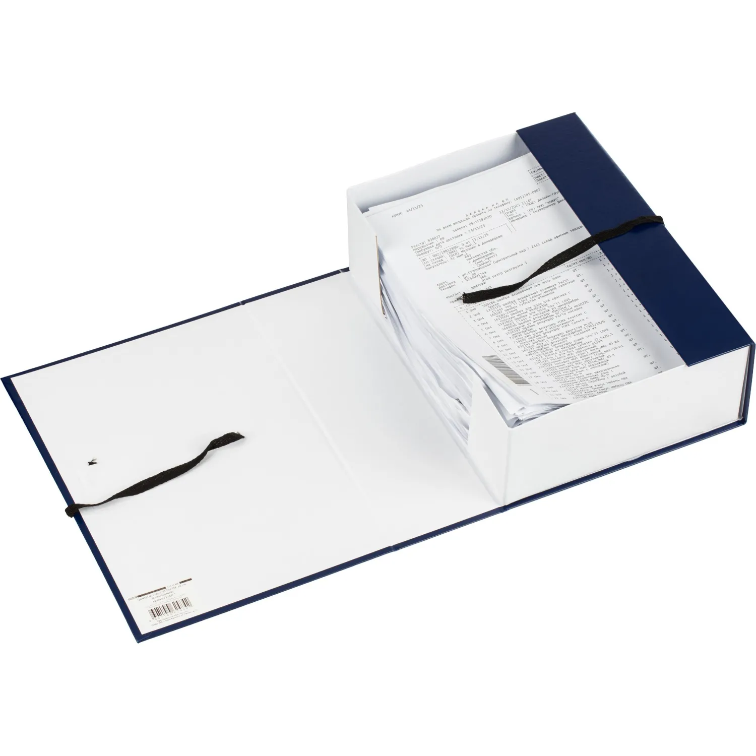 Нескладной архивный короб Attache формата А4 изготовлен из переплетного картона, снаружи покрыт бумвинилом синего цвета (материал на основе ПВХ). В закрытом виде фиксируется с помощью двух хлопчатобумажных завязок. Внутренние