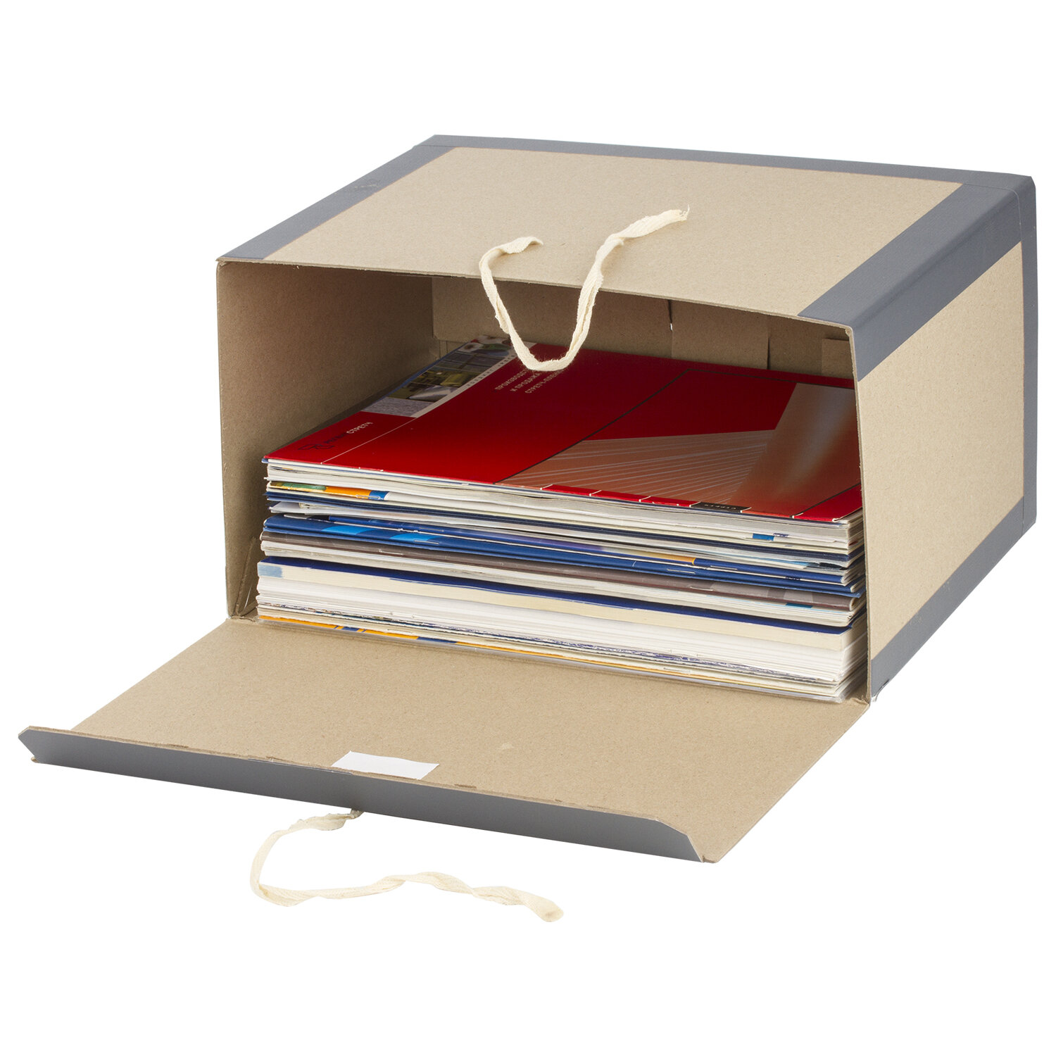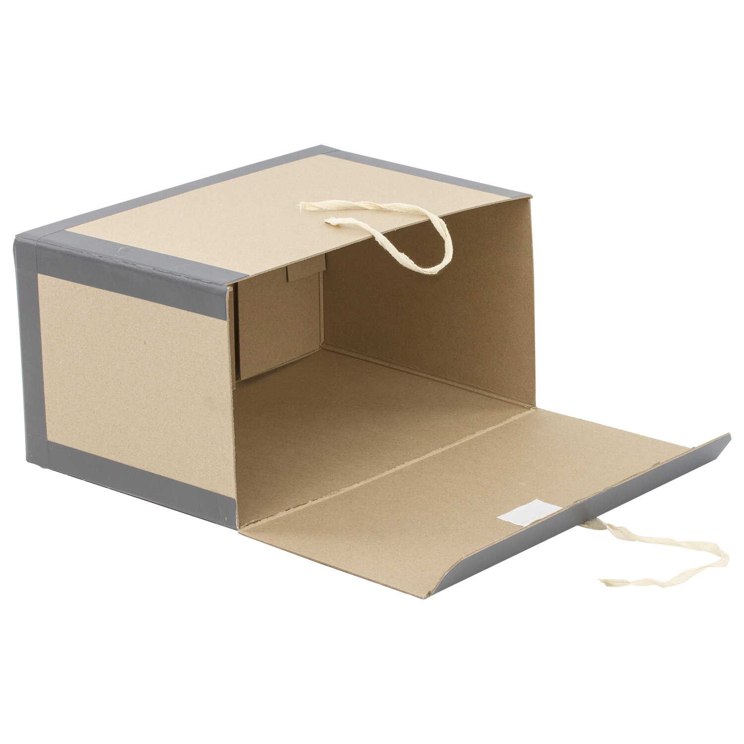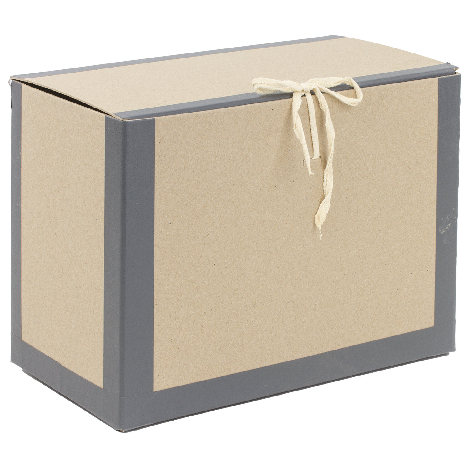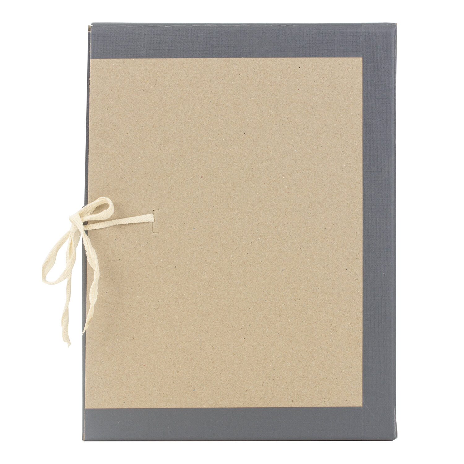 Изготовлен из переплетного картона толщиной 1,75 мм с покрытием из бумвинила. Имеет поля для записей на лицевой стороне. Вмещает до 1700 листов. Выдерживает до 15 кг. Размер короба - 33x18x24 см. Имеет откидную крышку и 2 хлопчатобумажные завязки. Поставляется в разобранном виде.
