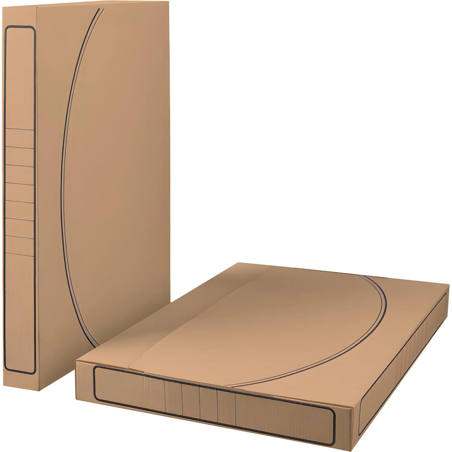Возможно вертикальное и горизонтальное размещение, на стеллажах или в архивных коробах. Легкая сборка. Крышка короба фиксируется вырубным клапаном. На корешке и боковых сторонах есть поля для надписей.