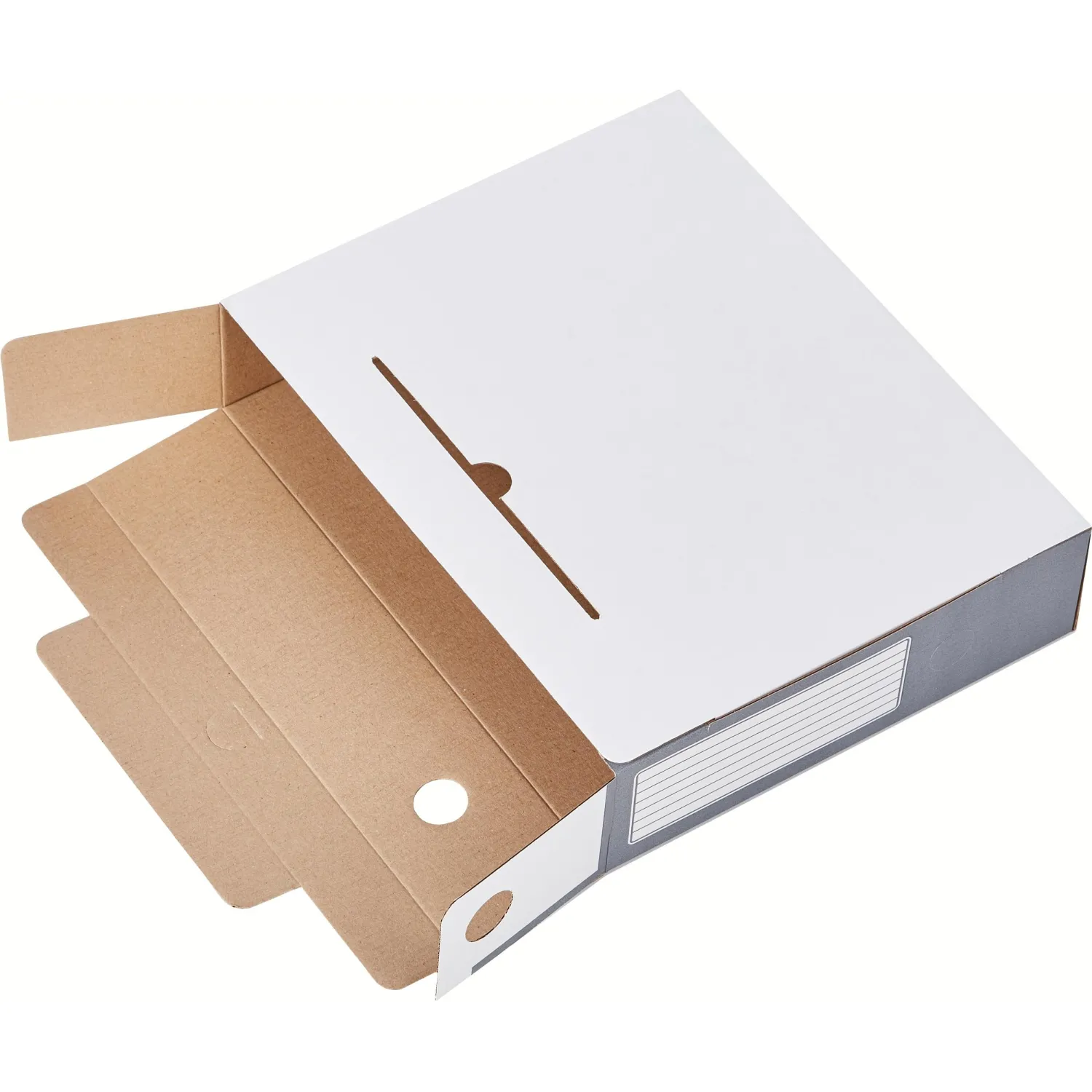 Возможно вертикальное и горизонтальное размещение, на стеллажах или в архивных коробах. Легкая сборка. Крышка короба фиксируется вырубным клапаном. На корешке и боковых сторонах есть поля для надписей.