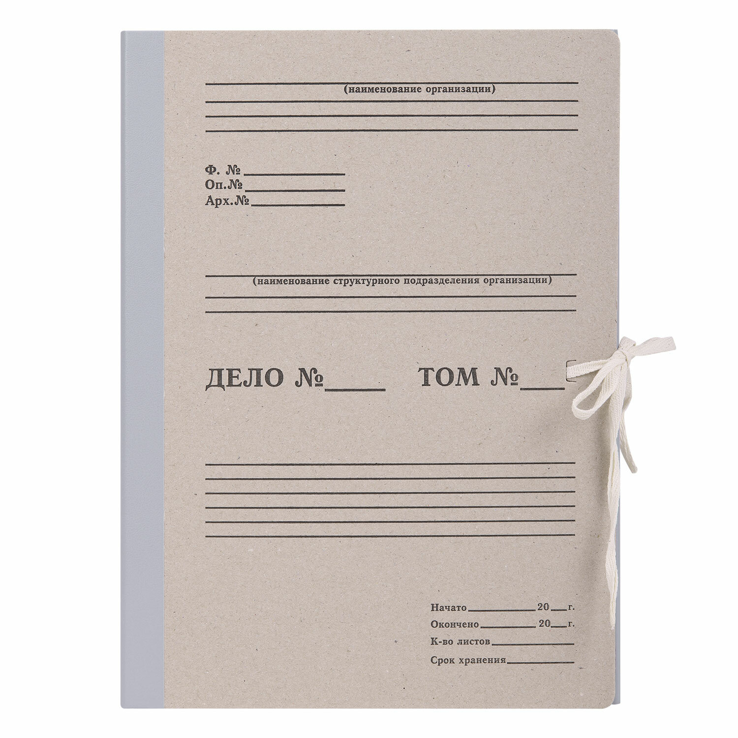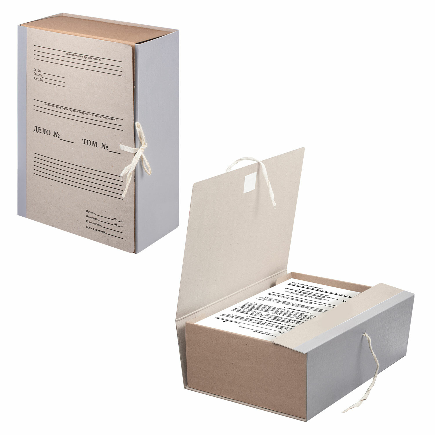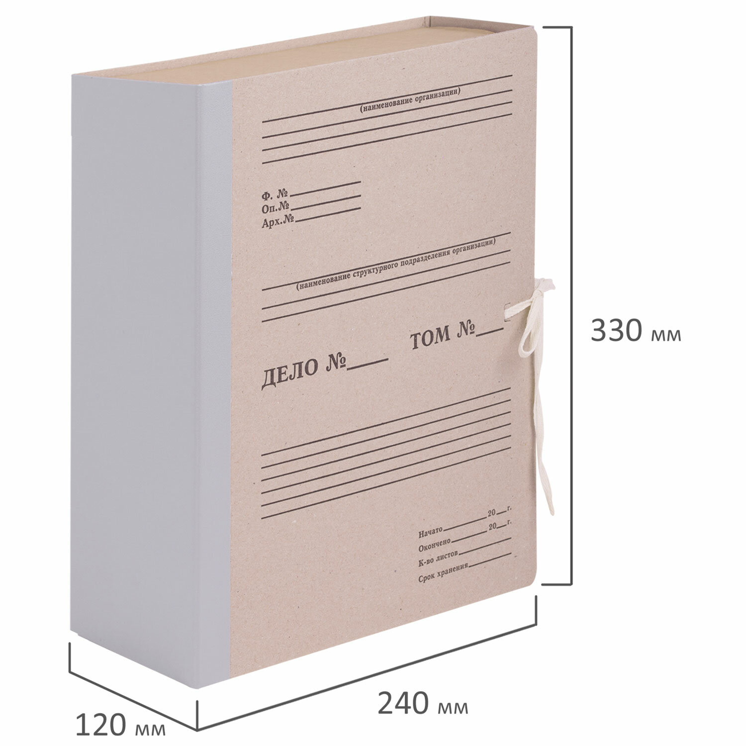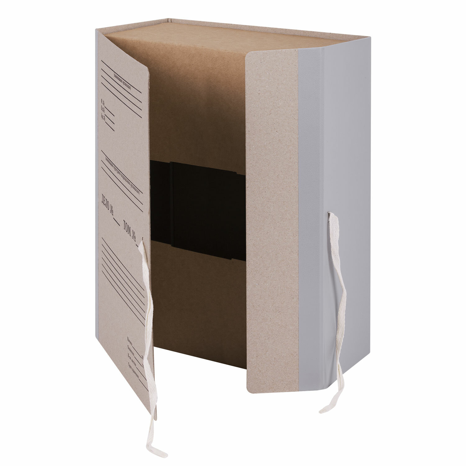 Изготовлен из переплетного картона толщиной 1,5 мм с покрытием бумвинил. Имеет поля для записей на лицевой стороне. Вмещает до 1000 листов. Выдерживает до 5,2 кг. Размер короба - 33x12x24 см. Имеет откидную крышку и 2 хлопчатобумажные завязки. Поставляется в разобранном виде.