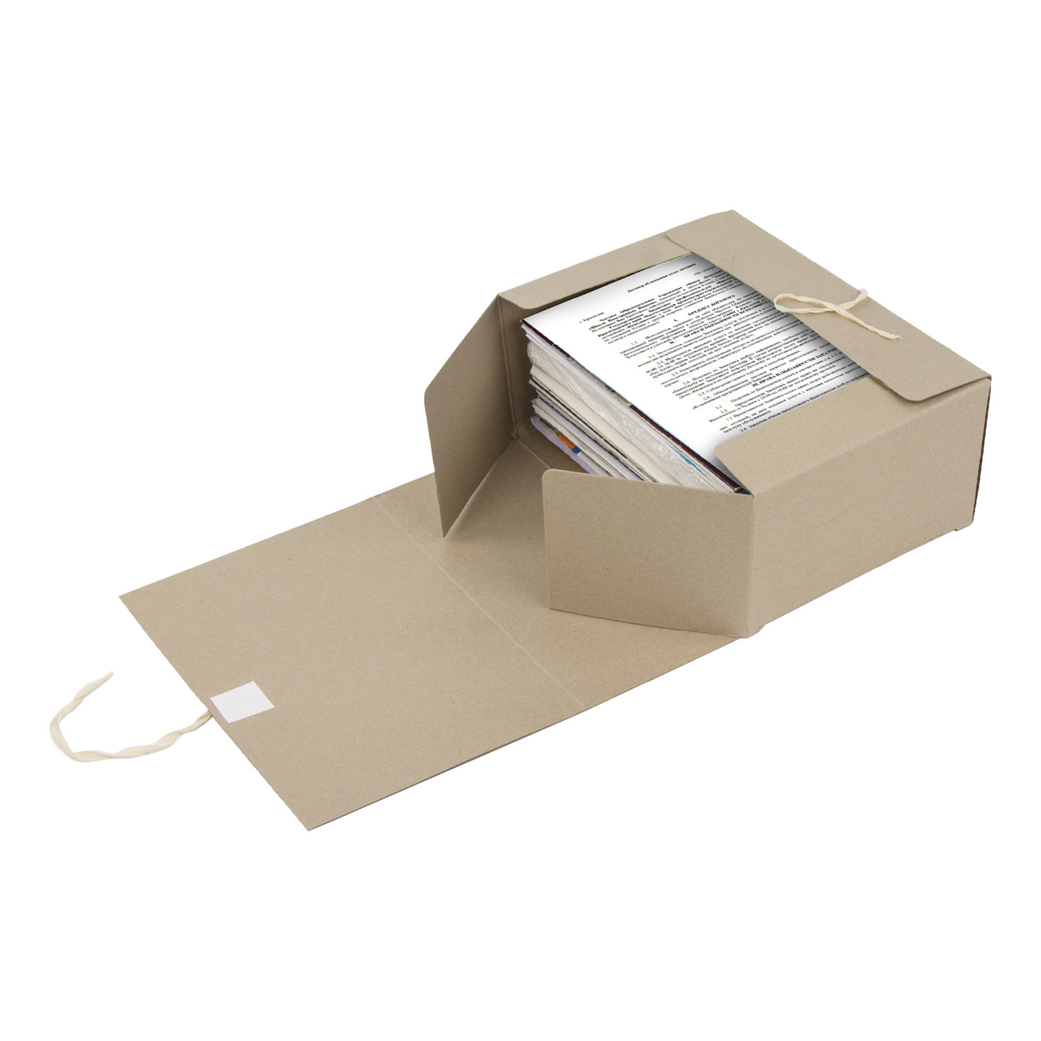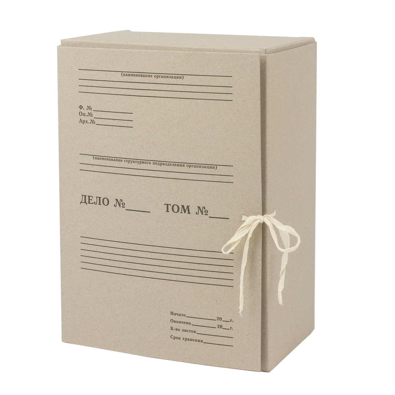 Изготовлен из переплетного картона толщиной 1,25 мм. Имеет поля для записей на лицевой стороне. Вмещает до 1400 листов. Выдерживает до 7 кг. Размер короба - 33x15x24 см. Имеет откидную крышку и 2 хлопчатобумажные завязки. Поставляется в разобранном виде.