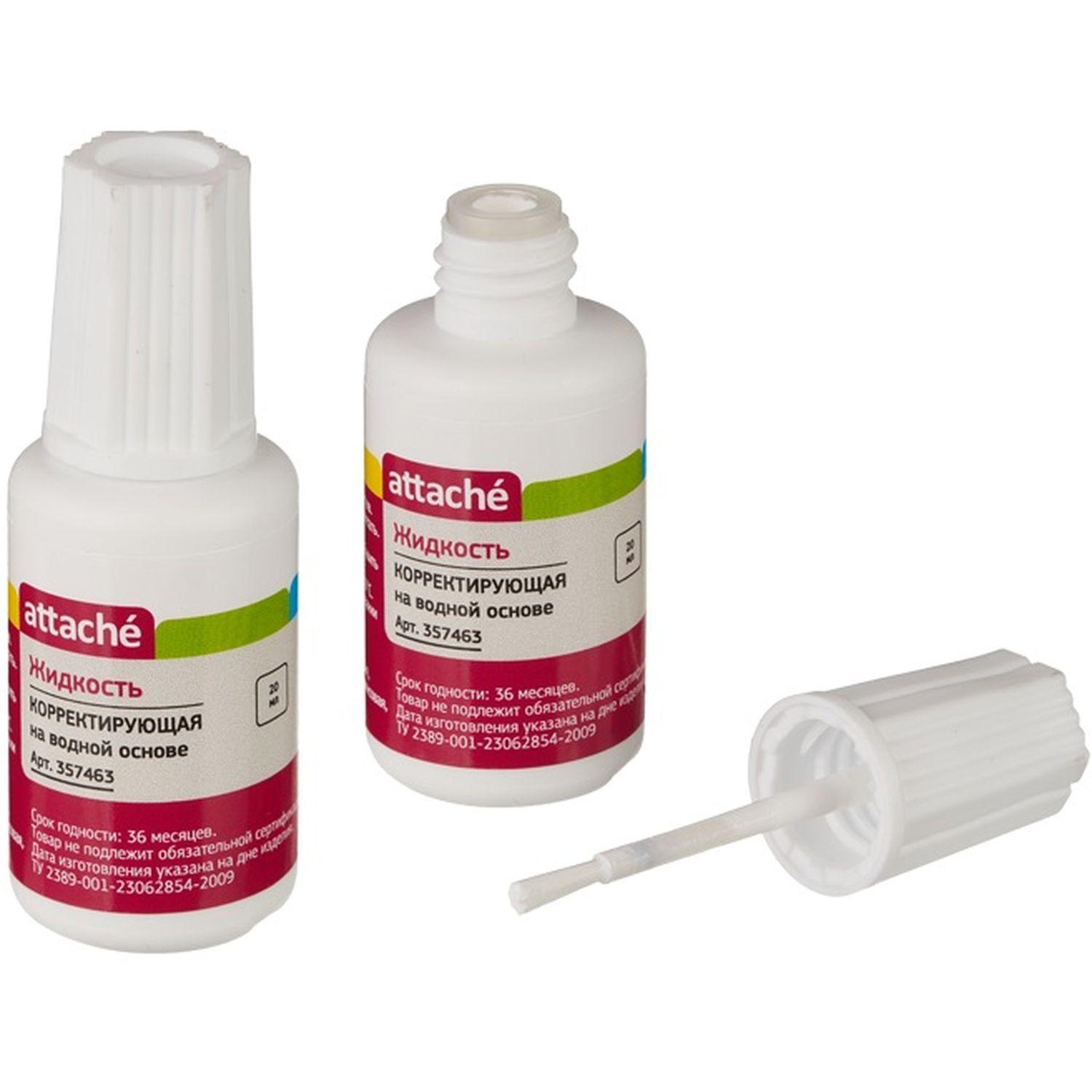 Корректирующая жидкость Attache применяется для корректировки всех типов документов, включая бумагу для факсов. Ложится ровным гладким слоем, создает непрозрачное покрытие. Имеет водную (эмульсионную) основу. Температура при транспортировке — до -40 градусов Цельсия. Вид кисточки — ворс. Объем флакона с корректирующей жидкостью составляет 20 мл.