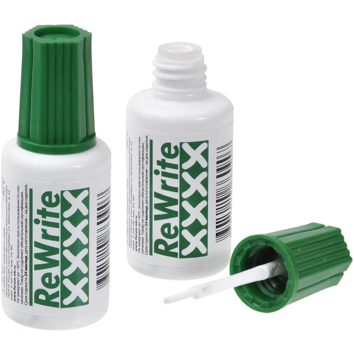 Корректирующая жидкость ReWrite на растворителе 20 мл применяется для корректировки всех видов чернил, рукописных и печатных текстов. Полностью закрашивает текст. Ложится ровным гладким слоем, создает непрозрачное покрытие. Имеет быстросохнущую основу. Во флаконе есть металлический шарик. Вид кисточки — ворс.