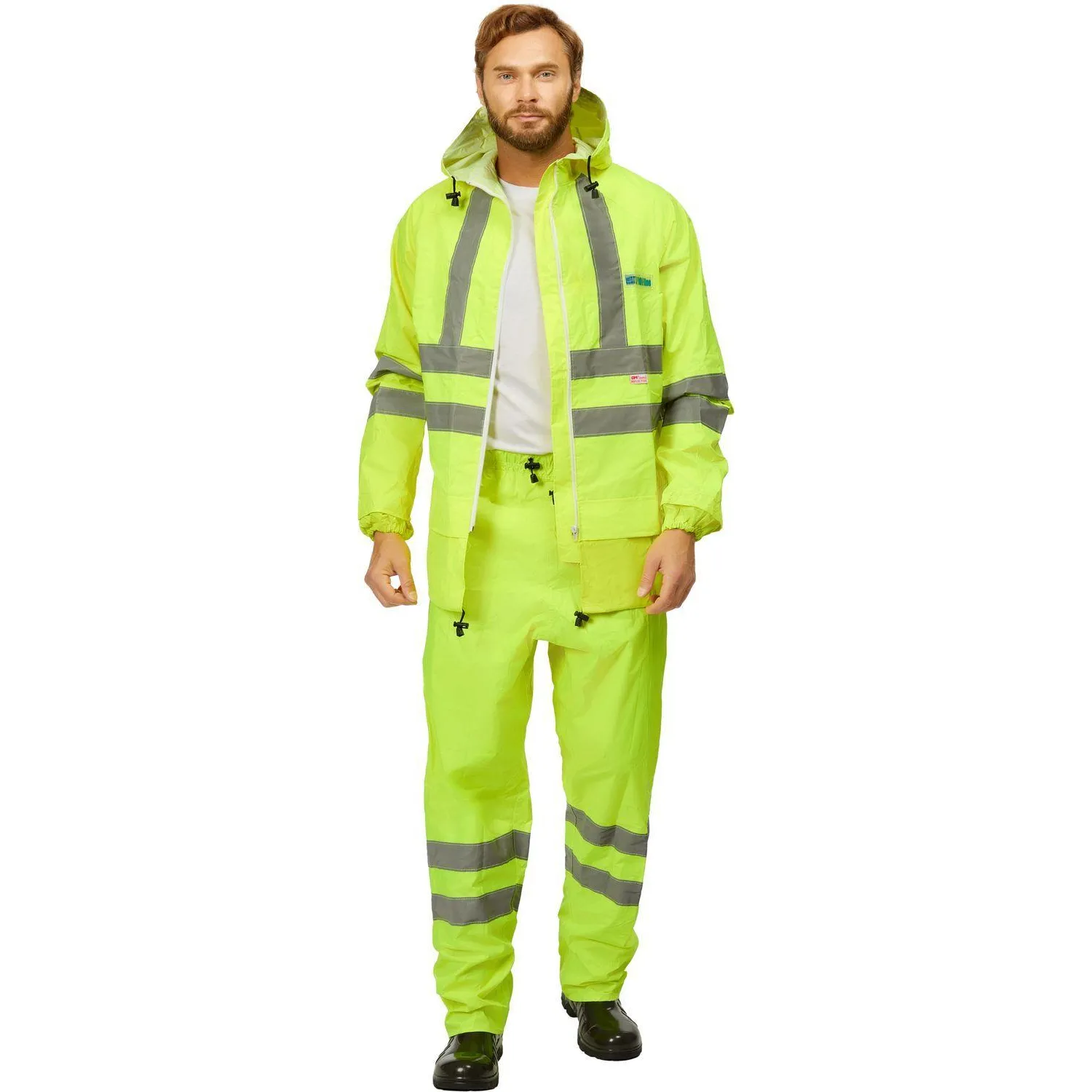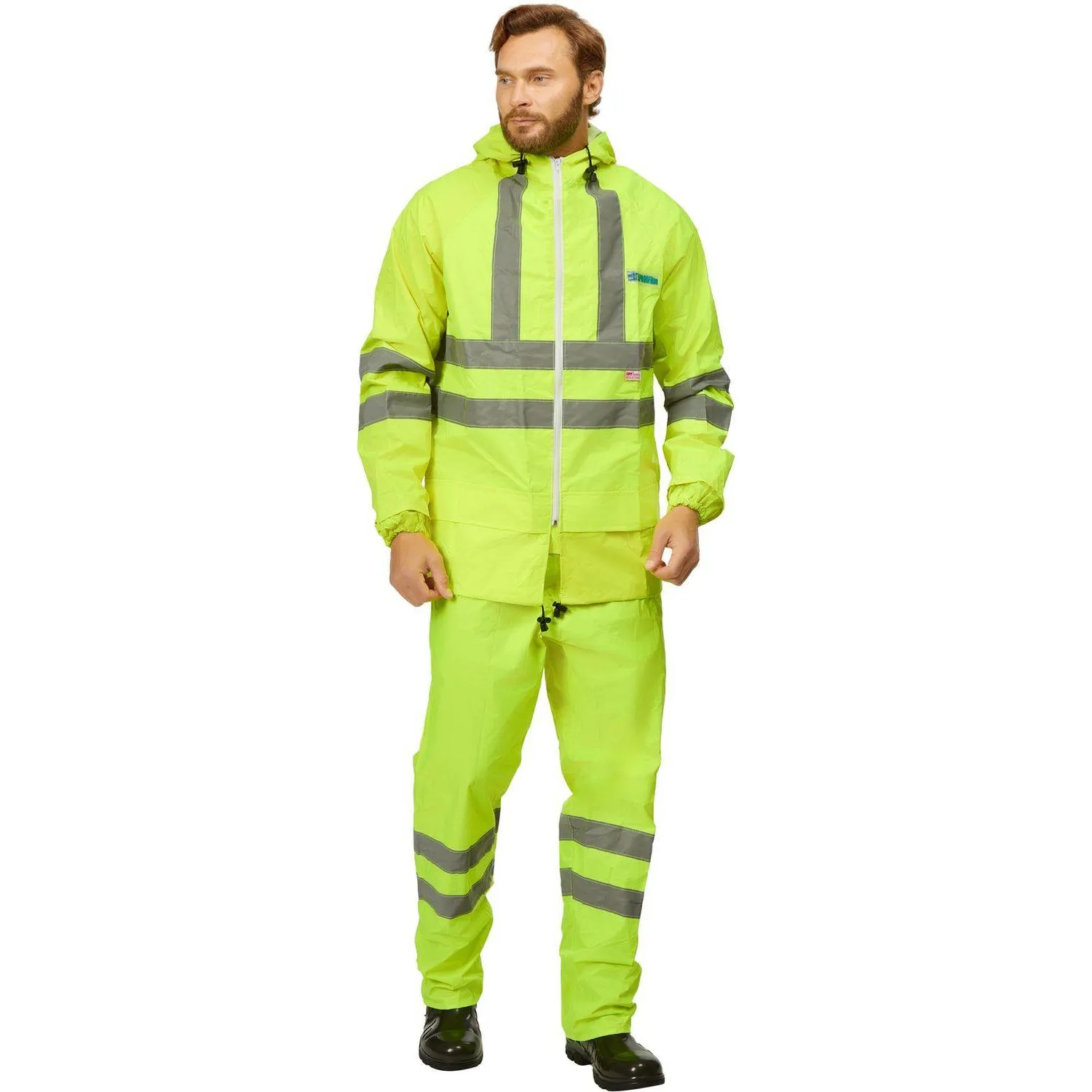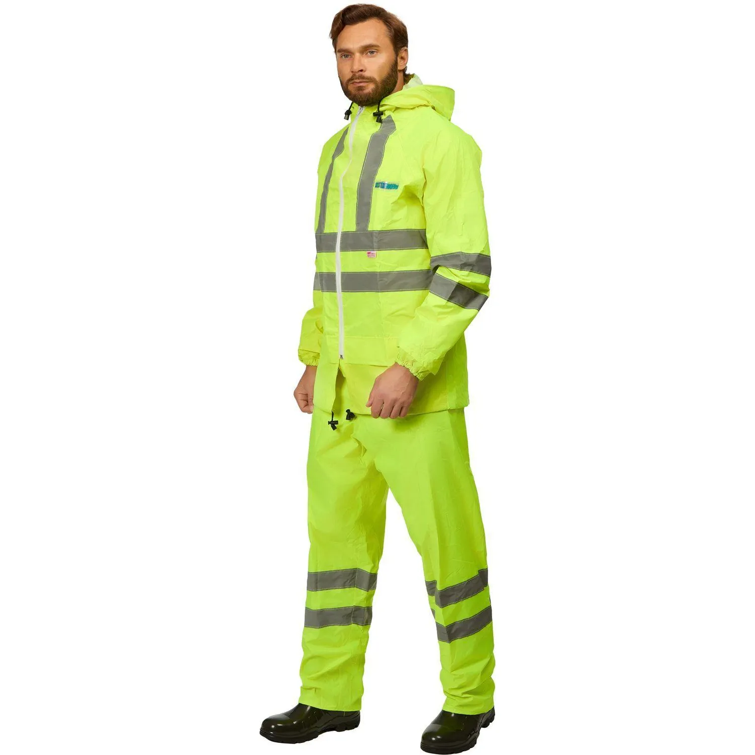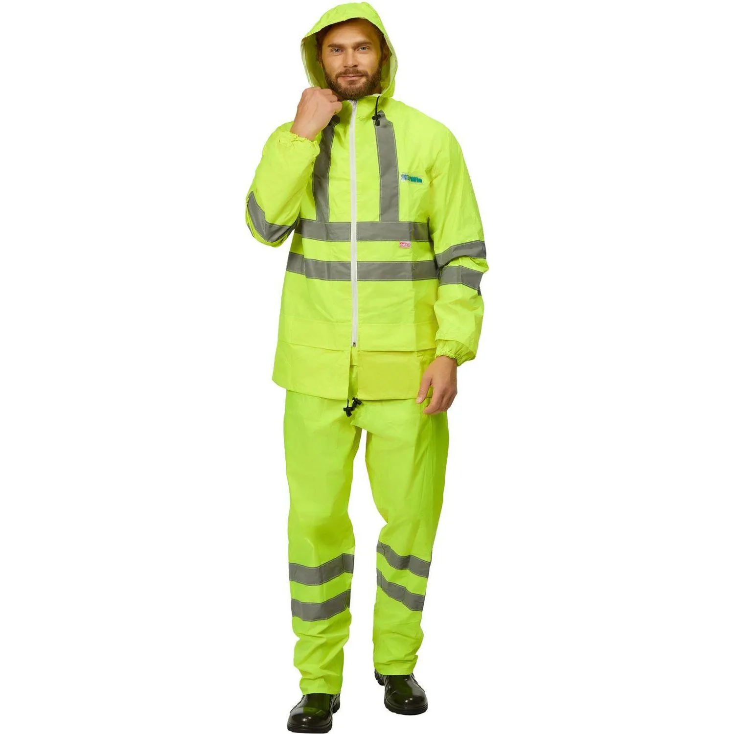 Влагозащитный костюм Extra-V-КБР изготовлен из прочной плащевой ткани с ПВХ-покрытием. Изделие представлено в лимонном цвете с широкой светоотражающей полосой 50 мм. Плотность ткани составляет 225 г/кв.м. Водоупорность — более 5000 мм водяного столба. Костюм соответствует европейским экологическим стандартам.