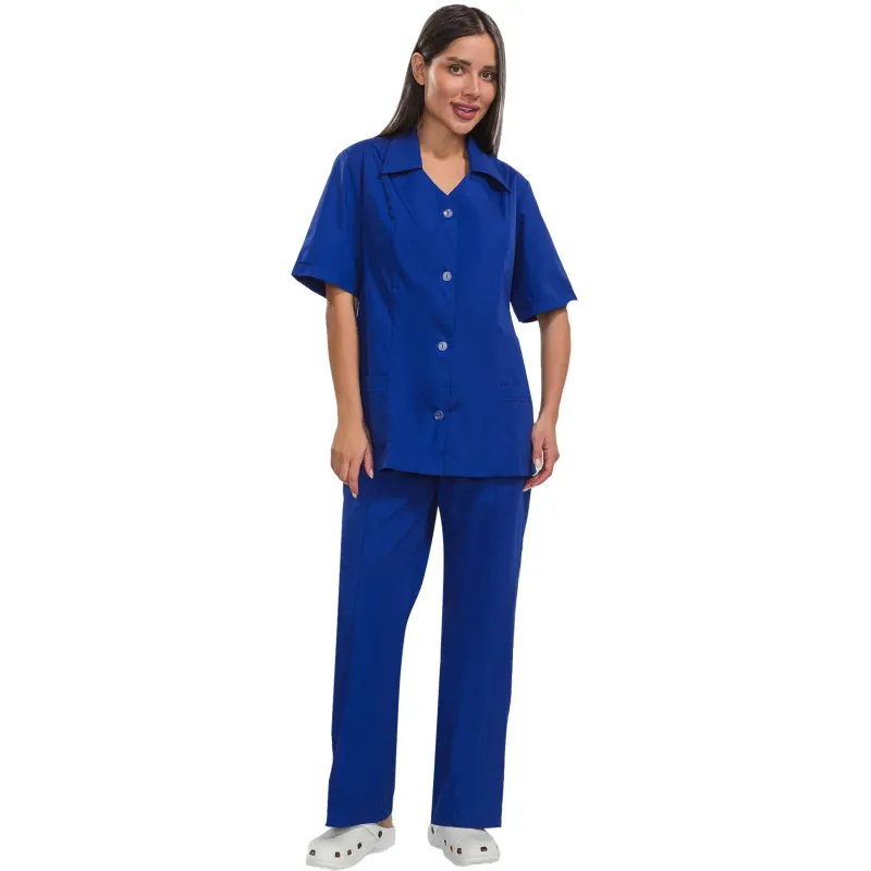 Рубашка имеет прямой крой, который не стесняет движений, и фиксируется на пуговицах. Воротник рубашки — отложной. В нижней части рубашки расположены два накладных кармана. Брюки также выполнены в классическом прямом крое и оснащены эластичной резинкой на поясе для регулировки посадки, что делает костюм еще более удобным для длительного использования.