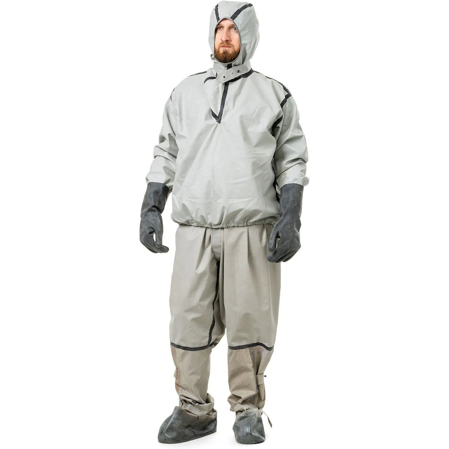 Он изготовлен из прорезиненной ткани Т-15 серого цвета плотностью 480, которая обеспечивает влагостойкость и устойчивость к общим производственным загрязнениям, нефти и нефтепродуктам, а также к истиранию. Герметичность достигается за счёт проклеенных швов, обработанных специальной лентой роликами, что повышает надёжность защиты при контакте с агрессивными средами.