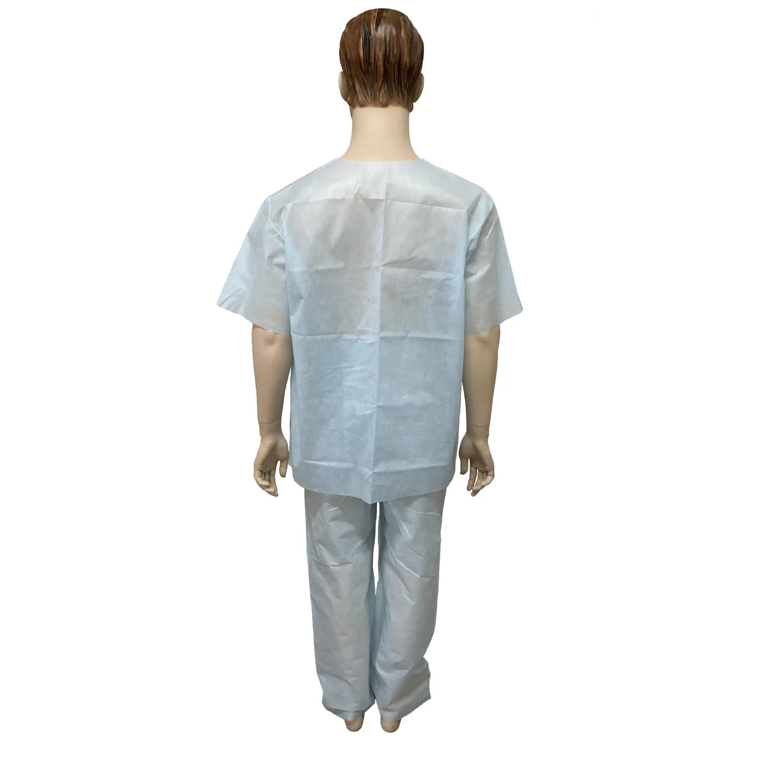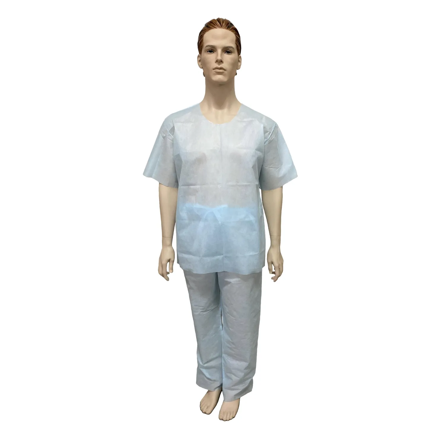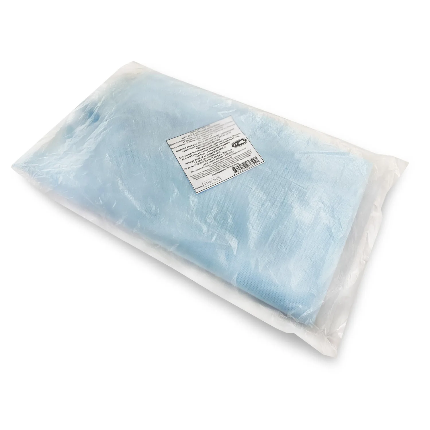 Костюм хирургический (рубашка + брюки). Размер 56-58. Костюм состоит из рубашки и брюк. Рубашка прямого силуэта, без застежки, рукав короткий. Длина рубашки 79 см, Брюки прямые, без бокового шва. Длина по боковому шву 122см. Швы наружные сварные (безниточные). Изготовлен из гипоаллергенного, безворсового, воздухопроницаемого, водоотталкивающего полипропиленового нетканого материала пл. 42 г/м2. V образный вырез горловины. Индивидуально упакован в комбинированный пакет из бумаги медицинской и многослойной полимерной пленки. Упаковка открывается без помощи ножниц. Стерильный.