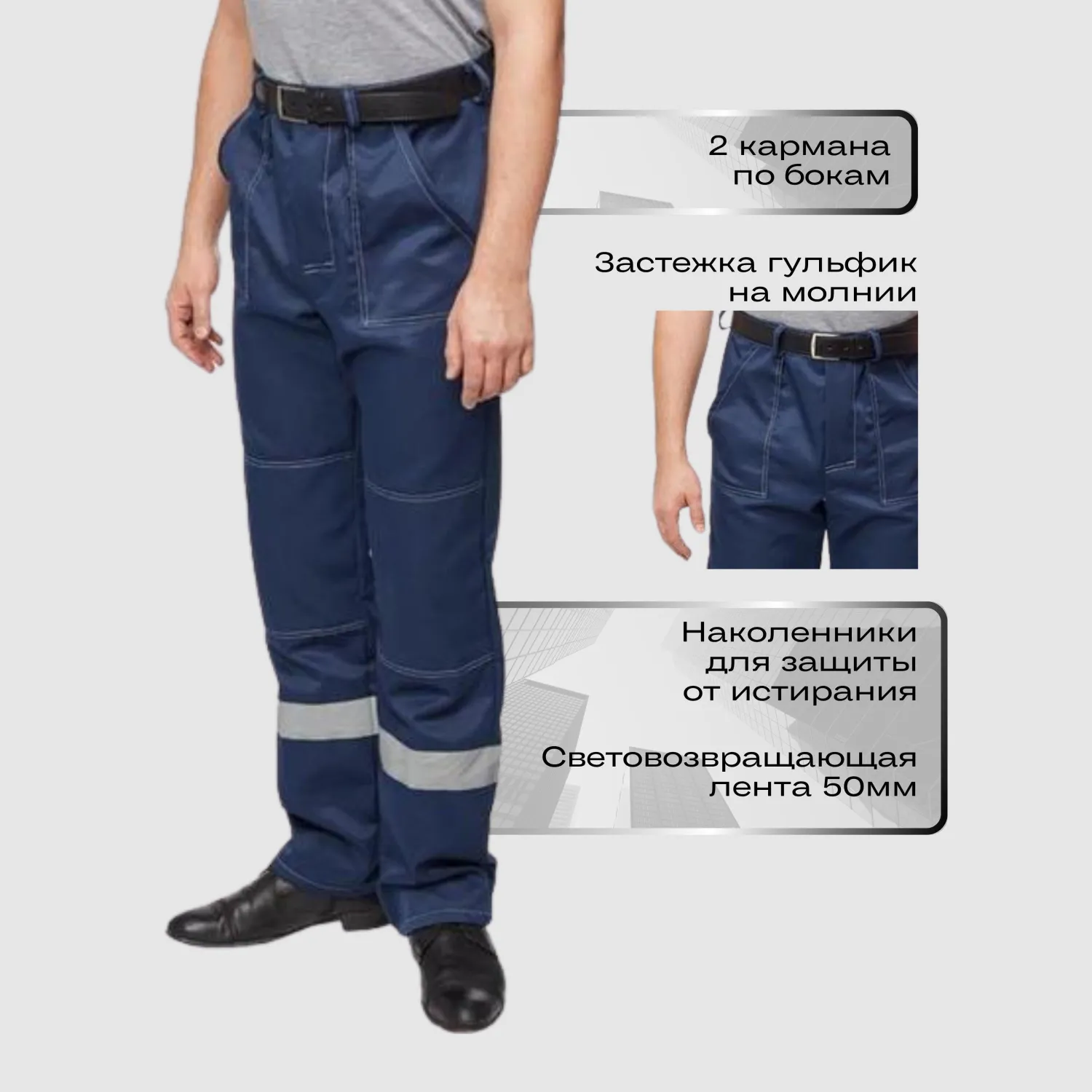 Брюки оснащены центральной застежкой на молнии и пуговицей по поясу. На поясе расположены шлевки для ремня. На брюках расположены два накладных кармана с наклонным входом. Дополнительные наколенники из основной ткани, для увеличения срока службы. Светоотражающая лента шириной 50 мм настрочена по низу брюк.