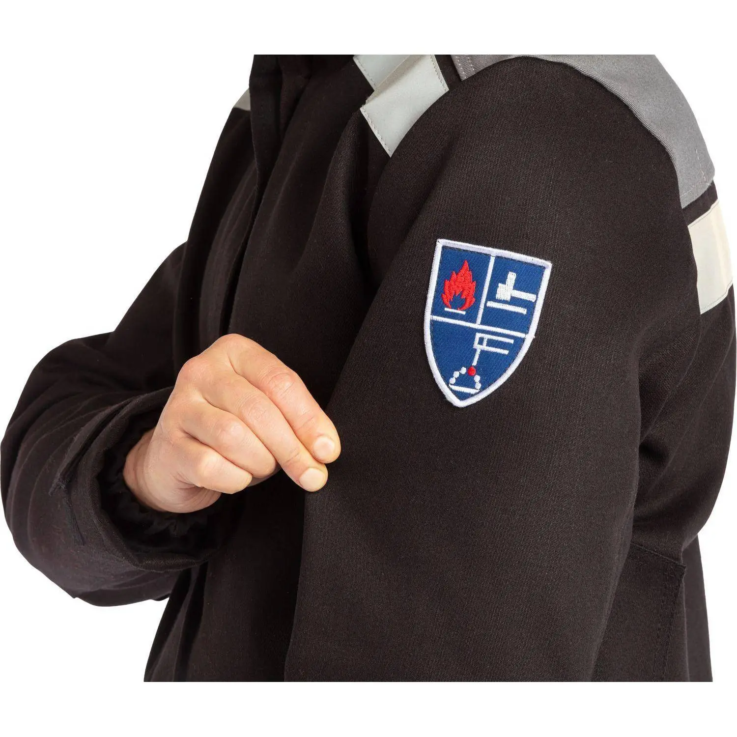 Ткань основная: хлопчатобумажная с огнезащитной пропиткой, плотность 450 г/кв.м. Накладки: хлопчатобумажная ткань с огнезащитной пропиткой, плотность 500 г/кв.м. Кокетка спинки выполнена из хлопчатобумажной ткани с огнезащитной пропиткой плотностью 450 г/кв.м, цвет — серый. Материал подкладки: 100% хлопок.