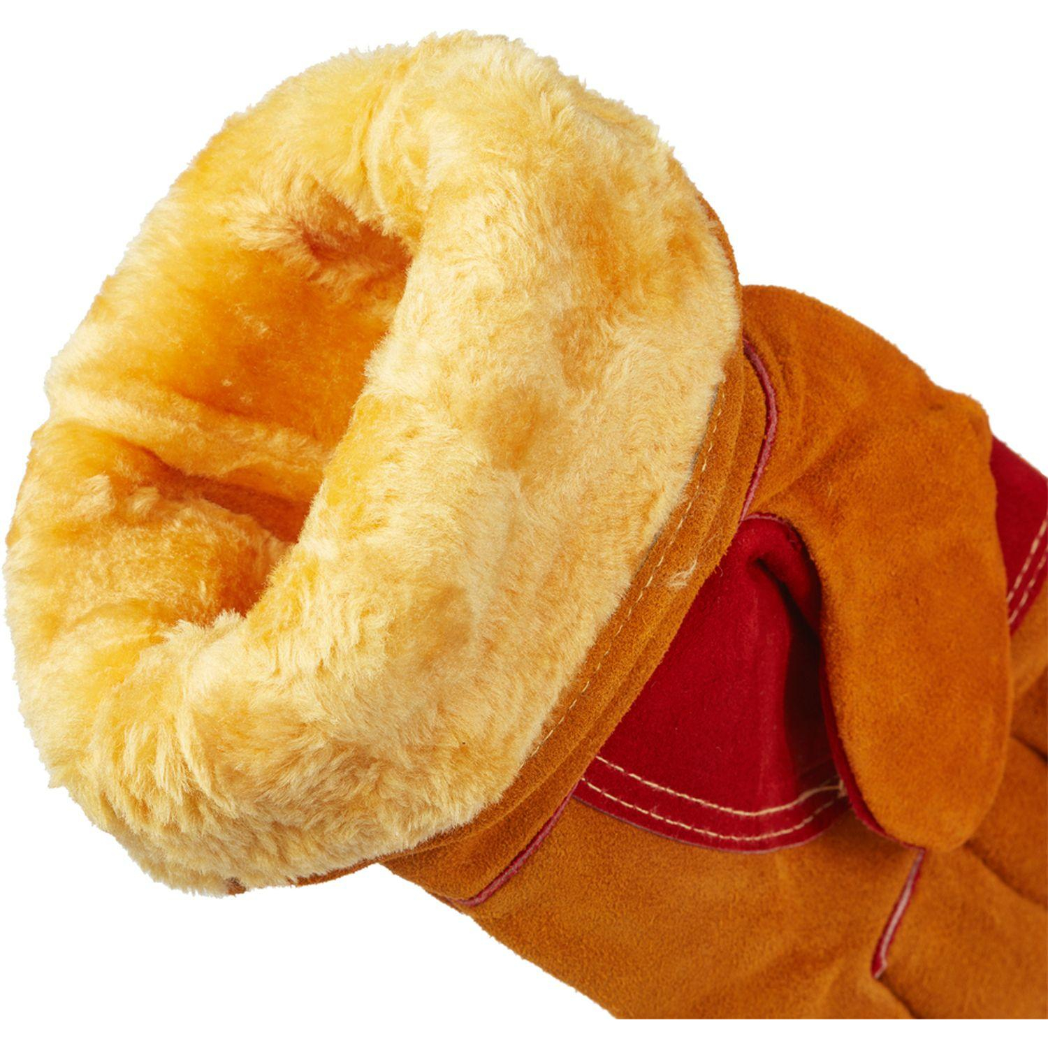 Краги спилковые утепленные пятипалые желтые меховые предназначены для защиты рук от механического воздействия, искр и брызг расплавленного металла в условиях низких температур. Швы — нить Кевлар, усилены кожаными вставками. Утеплены искуственным мехом. Размер — 10,5 (XL).