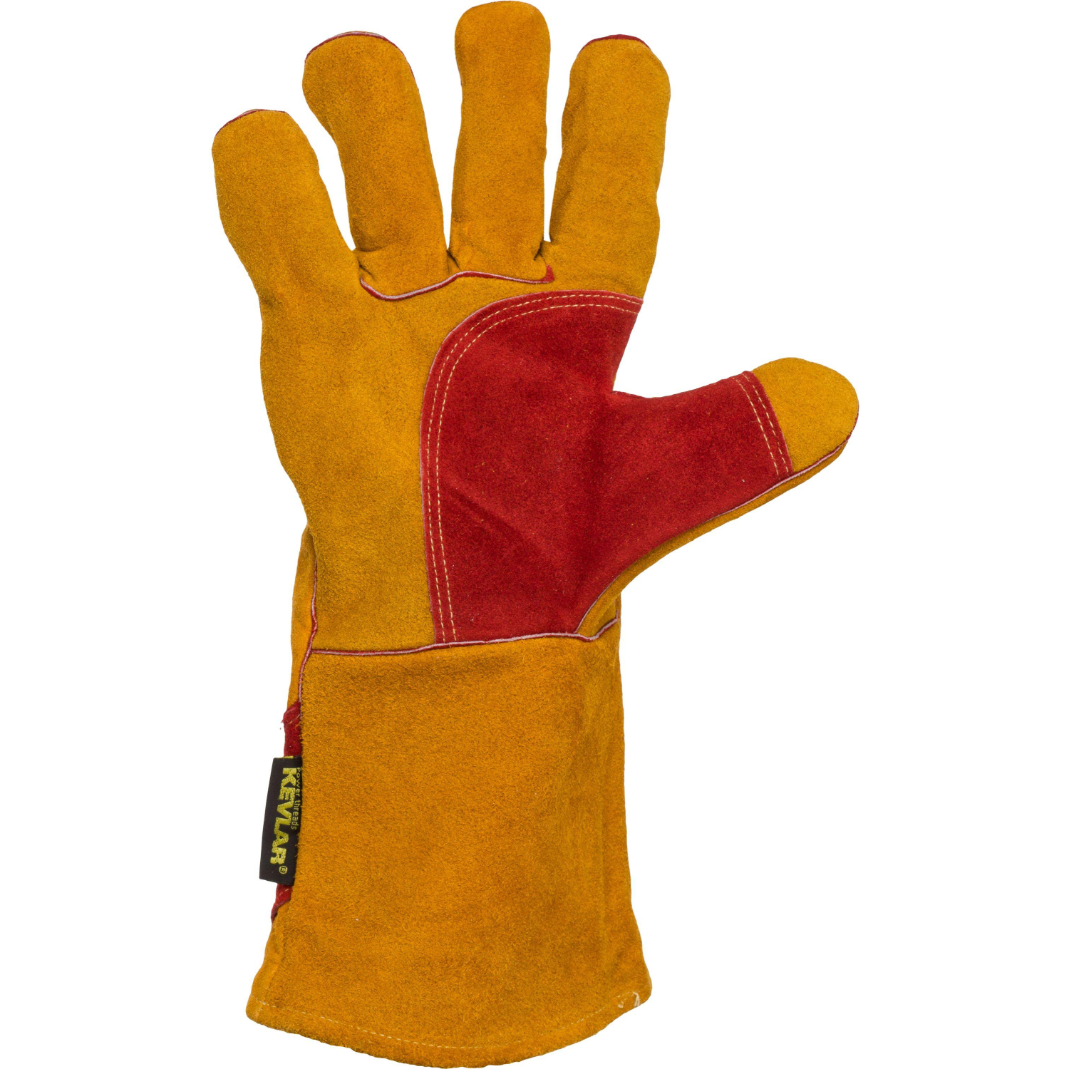 Краги сварщика спилковые усиленные Гренадер на флисовой подкладке пятипалые желтые, предназначены для защиты рук от механического воздействия, искр и брызг расплавленного металла и работ в условиях повышенных температур. Швы — нить Кевлар, усилены кожаными вставками. Ладонная часть и большой палец усилены накладками из спилка.
