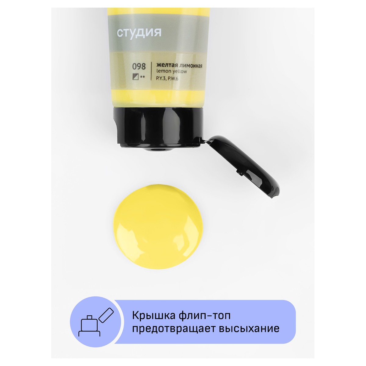 Новая акриловая краска серии «Студия» жёлтого лимонного цвета предназначена для художественно-живописных и декоративно-прикладных работ. Главные отличия: насыщенный цвет, густая консистенция, высокая адгезия, прочность красочного слоя. После высыхания краска становится глянцевой, практически не темнеет, специальная добавка позволяет максимально раскрыть красоту цвета. Художественный акрил прекрасно разносится, подходит для бумаги, картона, грунтованного холста, дерева, стекла, кожи, ткани. Время высыхания: от 10 минут до 1 часа в зависимости от толщины слоя. Прозрачный корпус тубы позволяет увидеть цвет краски, а удобная крышка флип-топ предотвращает высыхание. Объём тубы — 75 мл.