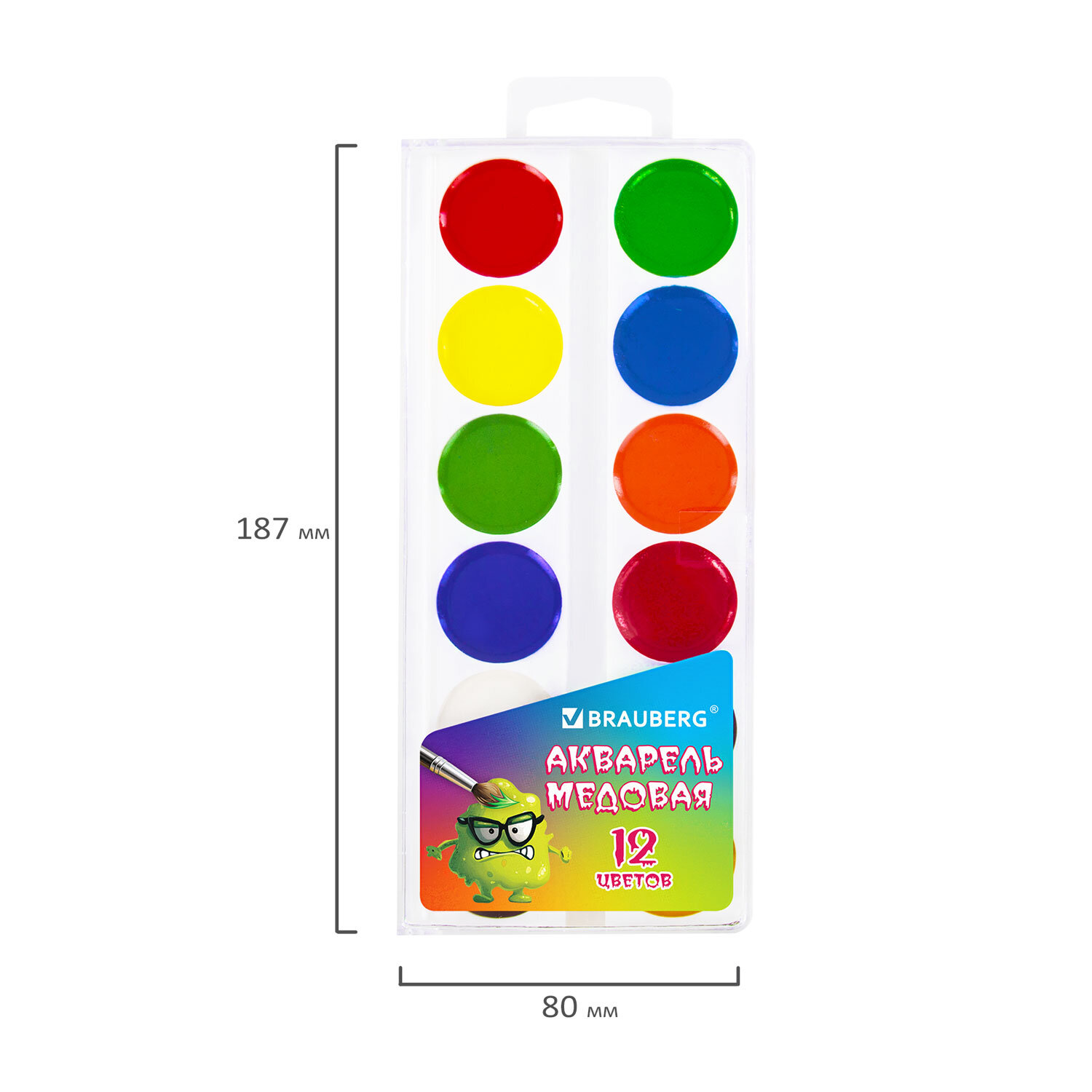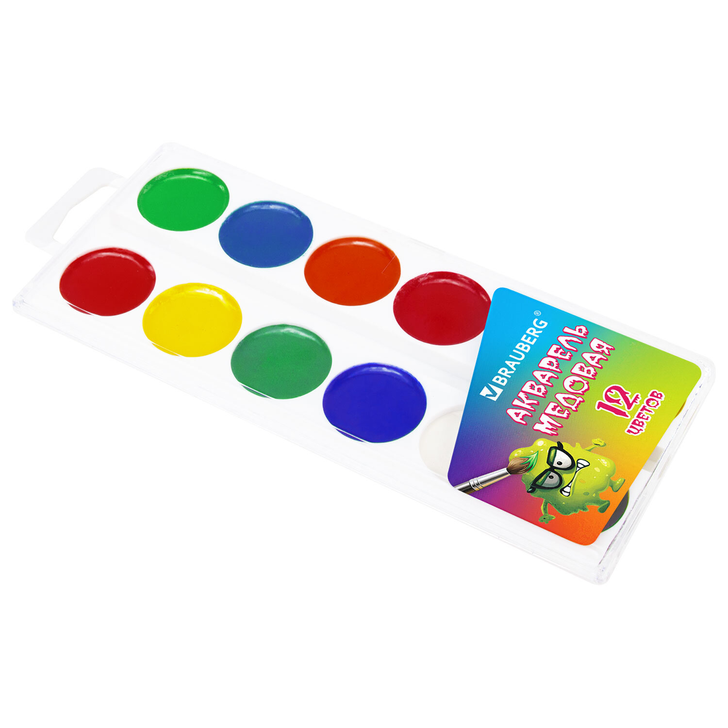 О товаре «Краски акварельные BRAUBERG "МОНСТРИКИ", медовые, 12 цветов, круглые кюветы, 192641»