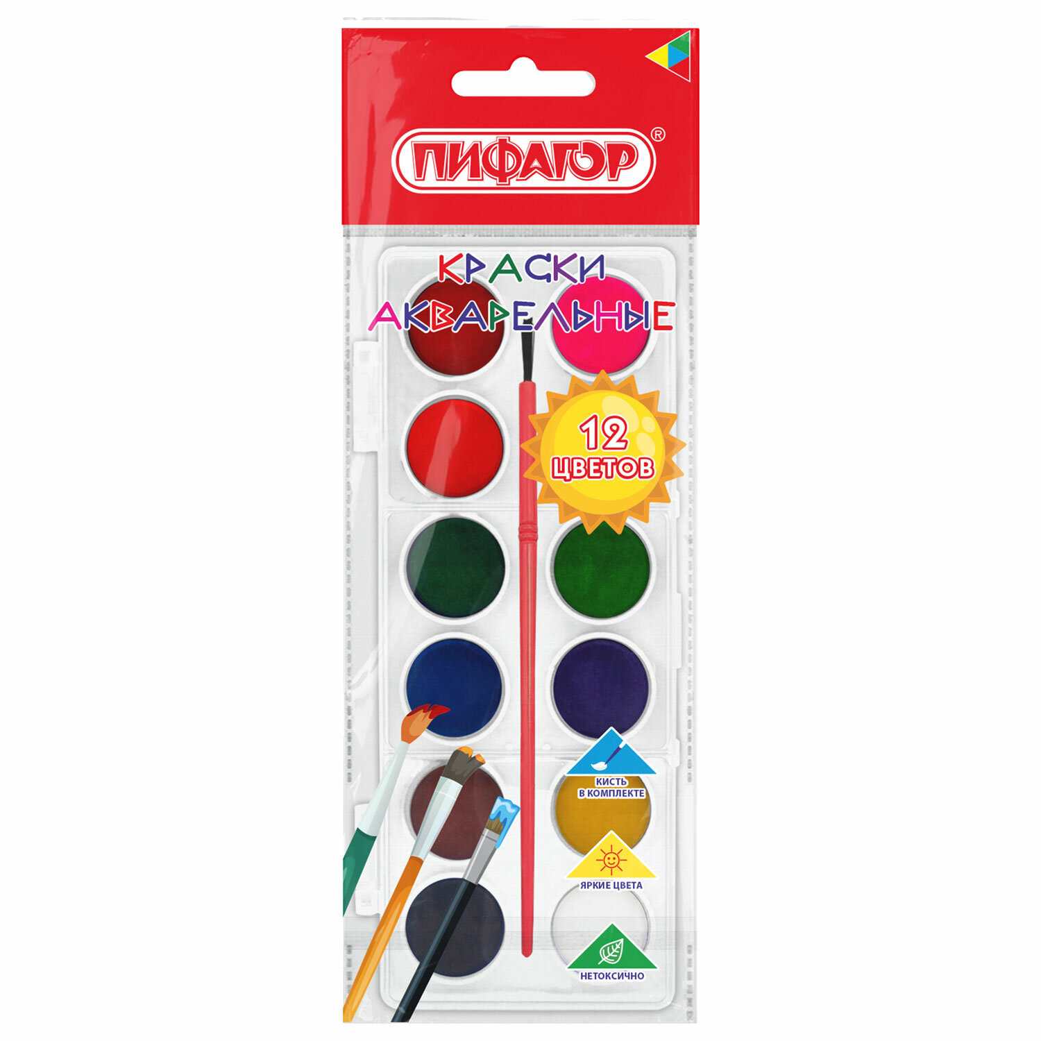 О товаре «Краски акварельные ПИФАГОР "СОЛНЫШКО", 12 цветов, круглые кюветы, пенал, 192635»