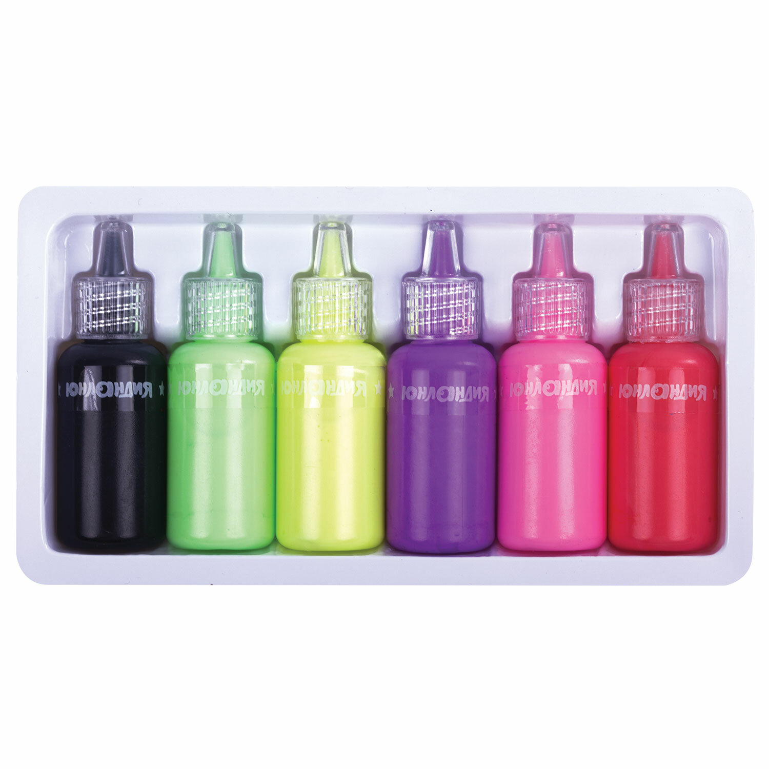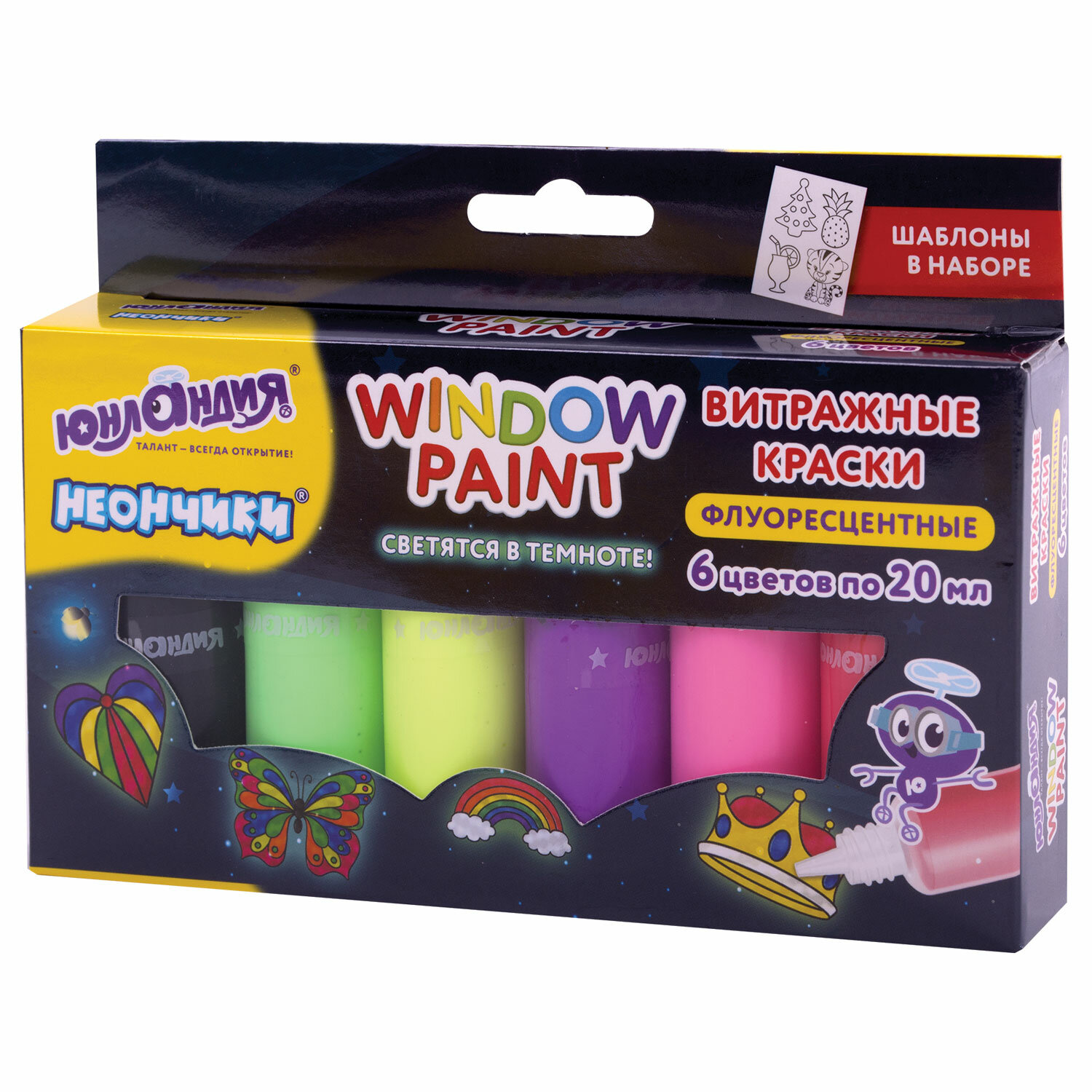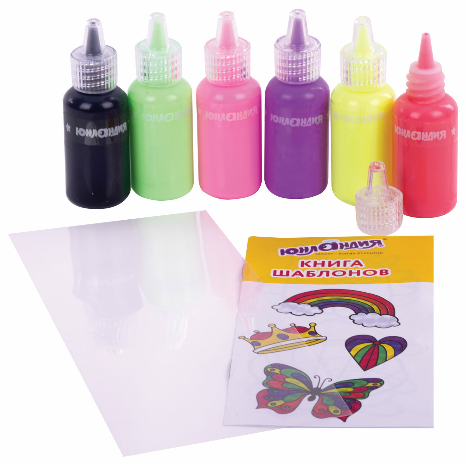 Краски витражные ЮНЛАНДИЯ "НЕОНЧИКИ", 5 цветов светящихся в темноте + 1 черный, 20 мл, шаблоны, 191760