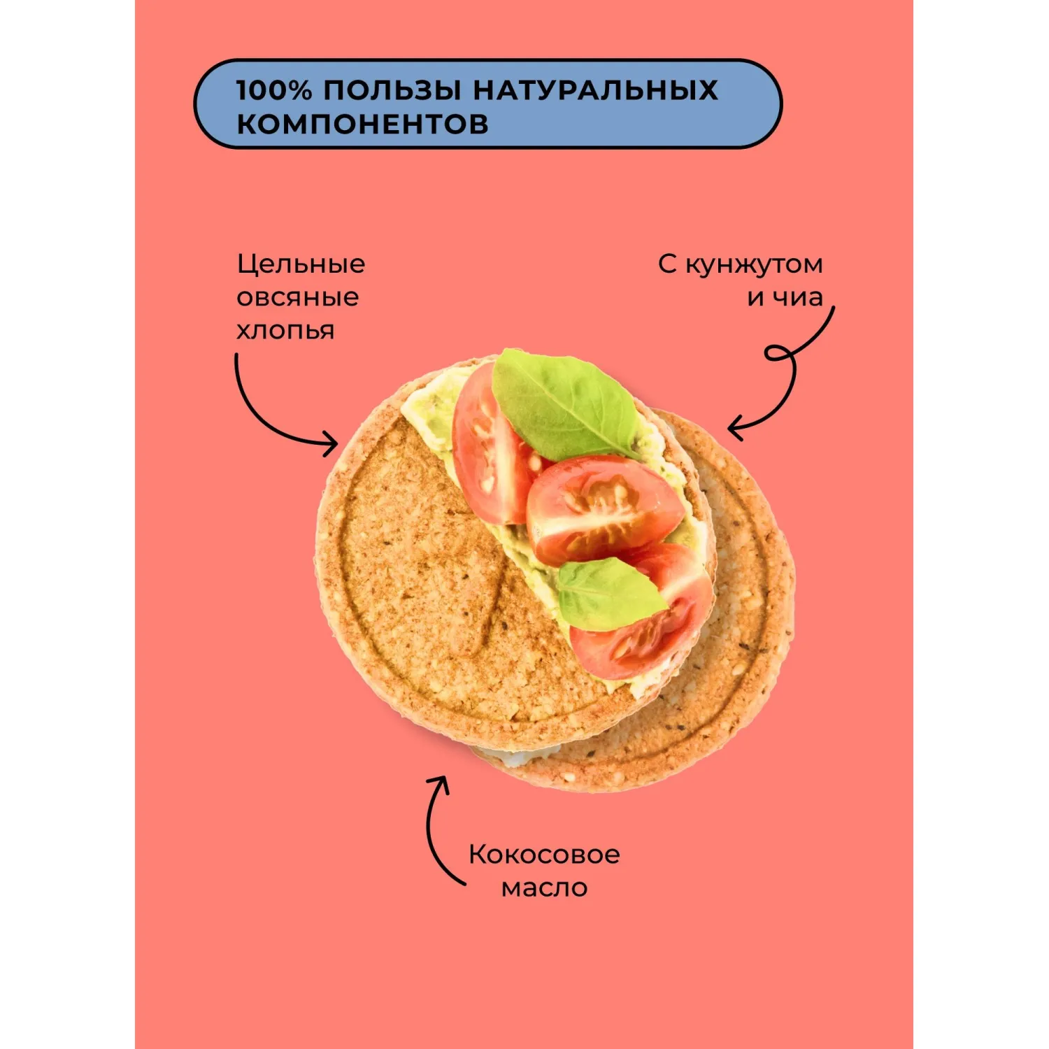 Крекеры содержат полезные жиры из кунжута и чиа, которые делают снек питательным. На 100 г приходится 8.5 г белков, 23 г жиров, 50 г углеводов, 4.5 г пищевых волокон и 450 ккал. Энергетическая ценность — 1880 кДж. Продукт подходит веганам и помогает пищеварению благодаря овсянке.