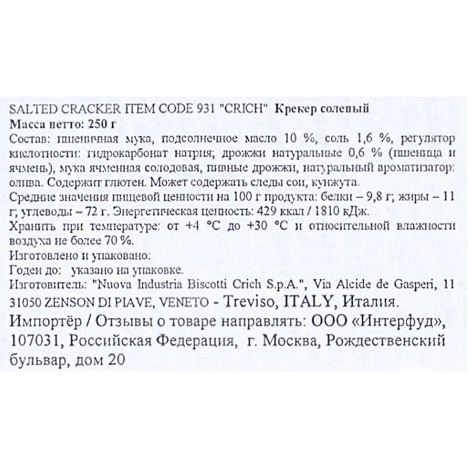 Крекер Crich соленый 250 г. Традиционная итальянская закуска приготовлена из отборной пшеничной муки с щепоткой соли. Аппетитно хрустящие крекеры с приятным легким вкусом отличаются насыщенным злаковым вкусом с солоноватыми и богатыми изысканными нотками ячменного солода. Тонкий аромат крекеров великолепно сочетается с сырами, полутвердыми, сливочными или творожными. Попробуйте их в сочетании с традиционными итальянскими закусками — пикантной салями, ароматной пармской ветчиной, нежнейшей моцареллой, помидорами черри. Также крекерами можно лакомиться в качестве легкого снэка в течение всего дня или подавать в качестве замены традиционного хлеба.