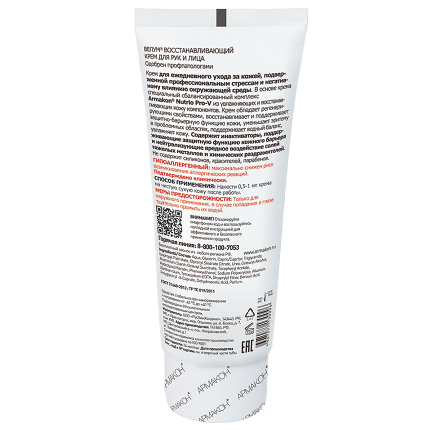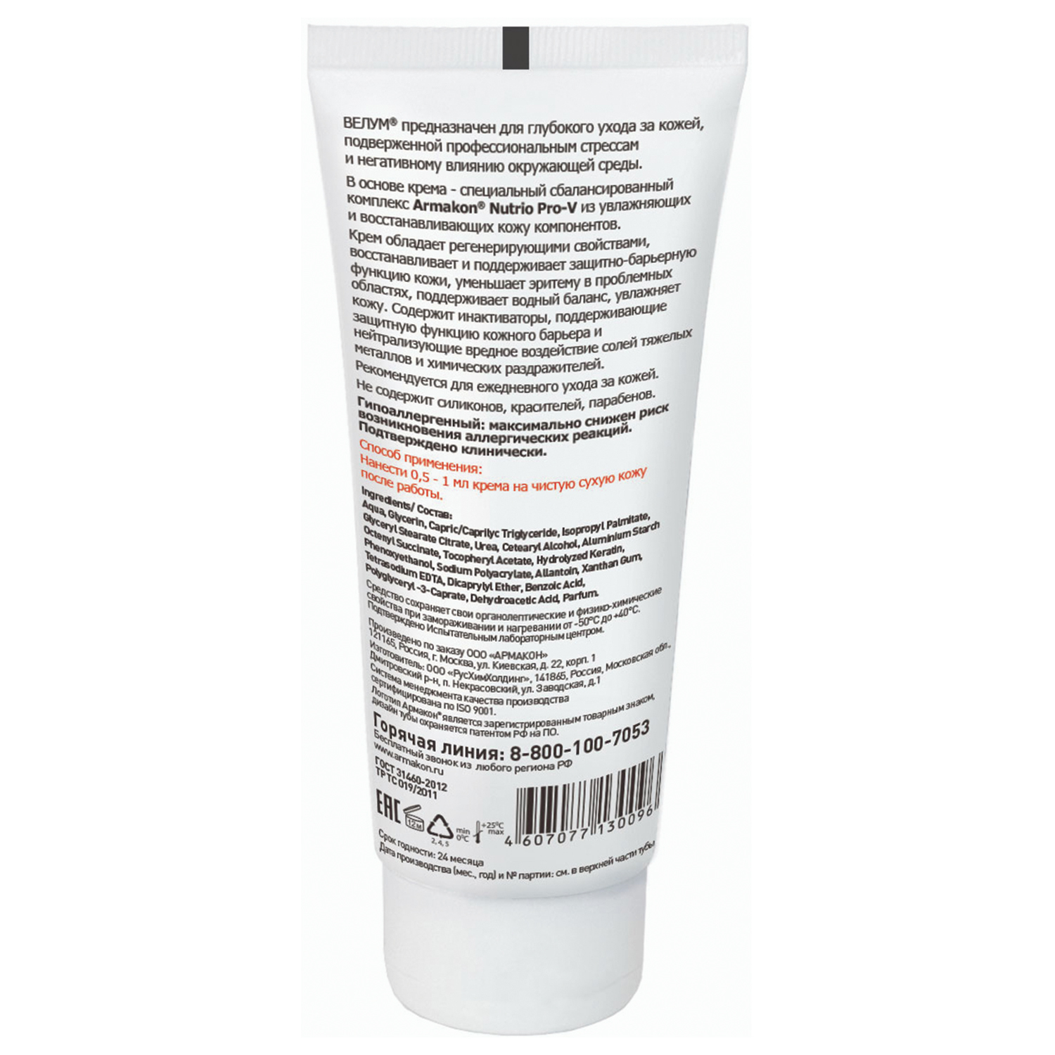 Крем Армакон Велум — восстанавливающий крем для рук и лица. Предназначен для глубокого ухода за кожей, подверженной профессиональным стрессам (контакт с водорастворимыми, водонерастворимыми и комбинированными загрязнителями) и негативному влиянию окружающей среды (ветер, снег, низкие температуры и т. п.). Благодаря входящему в состав специальному сбалансированному комплексу витаминов, увлажняющих и питательных компонентов Armakon Nutrio Pro-V, крем успокаивает и смягчает кожу, помогает в полной мере восстановить целостность кожного покрова, обладает регенерирующими свойствами, восстанавливает и поддерживает защитно-барьерную функцию кожи, уменьшает эритему в проблемных областях, поддерживает водный баланс, увлажняет кожу. Витамин Е — антиоксидант, увлажняет кожу, стимулирует процесс регенерации тканей. Глицерин обладает способностью аккумулировать влагу из воздуха и насыщать ее кожу. Аллантоин является эффективным заживляющим средством, обладает противовоспалительным действием. Кератин, изопропил пальмитат, жидкий парафин обладают великолепными смягчающими и регенерирующими свойствами. ВЕЛУМ содержит инактиваторы, поддерживающие защитную функцию кожного барьера и нейтрализующие вредное воздействие солей тяжелых металлов и химических раздражителей. Гипоаллергенность подтверждена сертификационным центром Service Allergy Swiss (SAS, Швейцария). Состав соответствует требованиям регламента ЕС № 1223/2009. Рекомендуется для ежедневного ухода за кожей. Не содержит силиконов, красителей, парабенов, формальдегид-производных. Соответствует стандартам ТР ТС 019/2011, ГОСТ 31460-2012. Упаковка: туба 100 мл. Условия хранения: избегать попадания прямых солнечных лучей. Срок годности от даты изготовления 24 месяца.